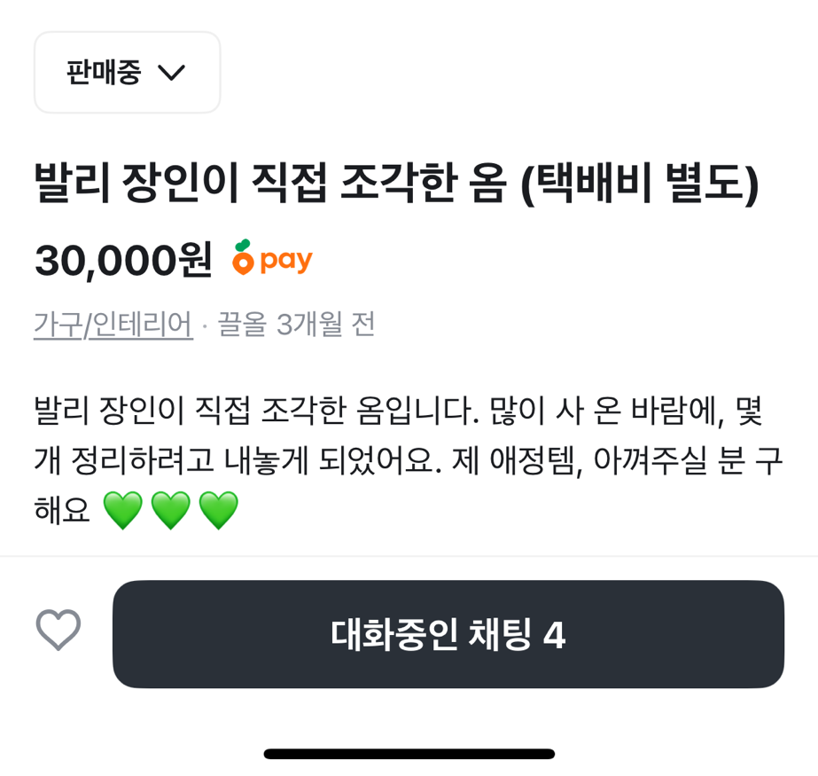 이건 스마트스토어에서 팔리겠지? 이 아이템으로 커머스를 경험할 생각이었다. 하지만 게으름이 도져 버렸다. 택배 시스템을 생각만 해도 머리가 지끈지끈 아팠다. 남들은 다 어떻게 하고 있을까. 시작하기 전에 포기해 버리고 싶었다. 하지만 이미 산 것을 버릴 수도 없었다. 그때 또 동생이 말했다 — ‘당근에 올릴까?’ 스마트스토어보다는 훨씬 쉬운 방법이었다. 사진과 글을 등록했다. 회사 근처, 집 근처, 동생 집 근처 할 것 없이.