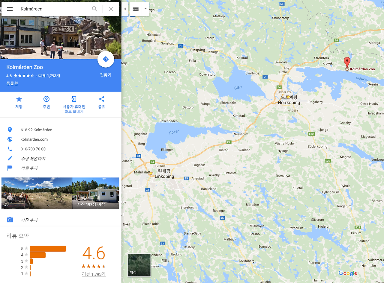 그러다가 알게 된 곳이 이번에 작성하게 될 Kolmården! Kolmården은 린셰핑에서 노르셰핑을 지나 북쪽으로 가면 찾을 수 있는 큰 규모의 동물원이다. 동물원이라고 하지만 동물원뿐만 아니라 놀이기구, 캠핑장 등 여러 가지가 복합적으로 있는 유원지의 느낌이 강하게 든다. 이 곳에 사는 주민들에게는 꽤나 유명한 곳이라서 어렸을 때 대부분 한두 번 혹은 그 이상 가보는 곳이다.