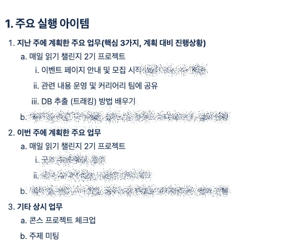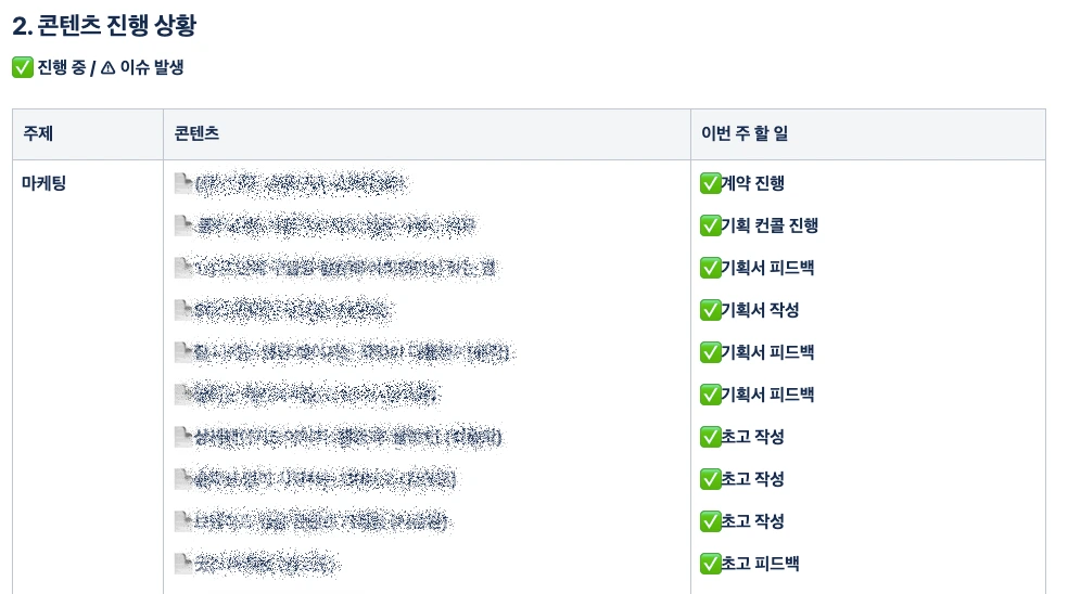 이 문서는 나의 매니저가(또는 나의 팀원들이) 이번 주에 무슨 일에 집중하는지 체크하고 서로 싱크를 맞추기 위한 목적으로 작성하는 문서인데요. 저의 경우 이번 주에 어떤 프로젝트(콘텐츠)들이 동시에 돌아가고 있는지, 그중 어떤 것에 가장 시간을 많이 써야 하는지 점검하는 용도로도 작성하고 있어요. 대략 이런 모양입니다.