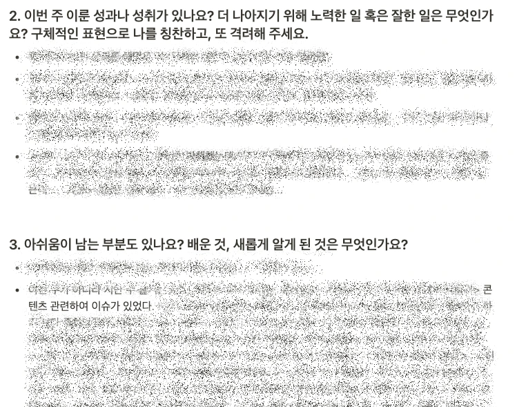 2) 이번 주 전반적인 나의 컨디션을 체크합니다. 신나서 열심히 했는지, 에너지가 떨어지진 않았는지, 유난히 집중이 안 되었는지 등. 왜 그랬는지 이유도 적어봅니다.