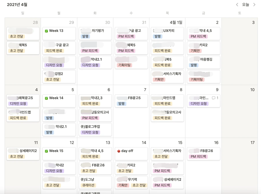 처음에는 아예 블록을 일별로 나눠서 만들었는데요. 그렇게 하면 전체 업무의 흐름이 보이지 않아서 한 주에 하나의 블록을 만들고 그 안에 일자별로 나눠 작성하는 방식으로 바꾸었어요.