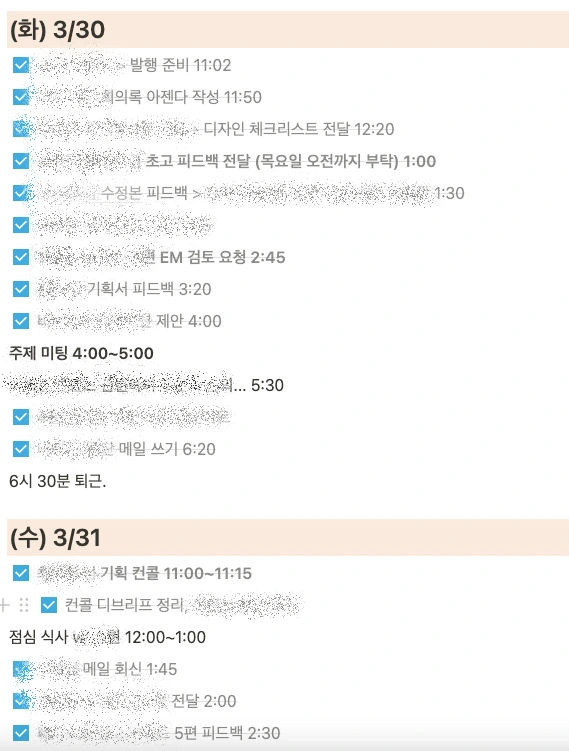 저는 제가 짠 계획대로, 순서대로 완벽하게 일을 해야 한다는 강박관념을 버렸어요. 그 대신 그 일에 시간을 얼마나 썼는지는 꼭 기록하려고 합니다. 이를 통해 내가 어떤 일에 얼만큼의 시간을 쓰고 있는지 감으로가 아니라 객관적으로 확인할 수 있고 이를 참고하여 더 좋은 계획을 세울 수 있게 됩니다. 위 이미지를 자세히 보면 항목마다 오른쪽 끝에 시간을 적어놓은 게 보일 텐데요. 이 일을 언제부터 언제까지 잡고 있었는지, 그래서 총시간을 얼마나 썼는지 확인할 수 있도록 한 것입니다.