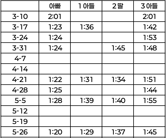 아빠가 결승선에 제일 먼저 들어와서 시계를 보니 1분 20초였다. 3월 17일에 처음 최선을 다해서 달렸을 때보다 3초 기록을 앞당겼다. 나이가 들어도 꾸준하게 훈련을 하면 조금씩 기량을 향상시킬 수 있다는게 느껴져서 뿌듯했다.