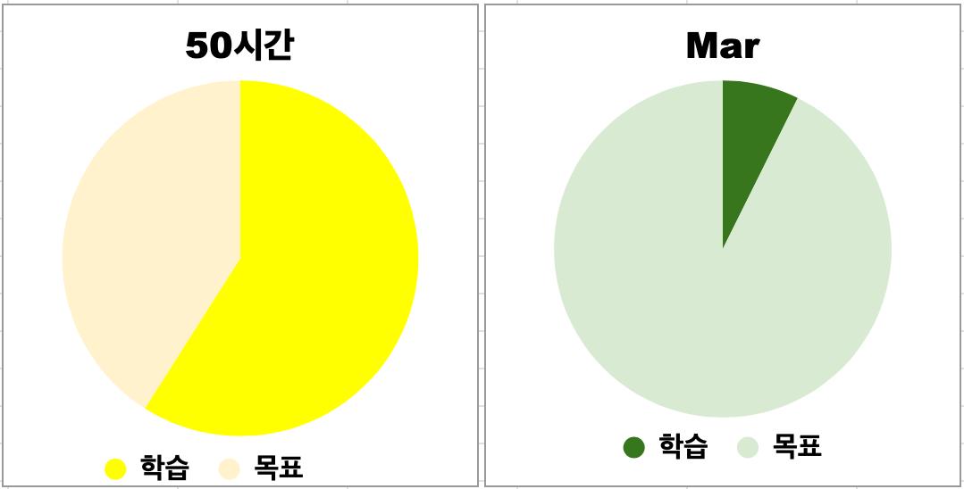 영어공부 일지를 쓰면서 내 공부 현황을 조금 더 확실하게 인지하기 위해서 원형 그래프를 그리고 있다. 왼쪽은 1차 목표인 50시간 그래프이고, 오른쪽은 3월의 목표인 30시간 그래프이다. 매일 영어공부 일지를 기록하면서 이 그래프가 채워져가는 모습을 보면 내가 지금 얼마나 노력하고 있는지에 대해서 보다 객관적으로 점검할 수 있을 것 같다.