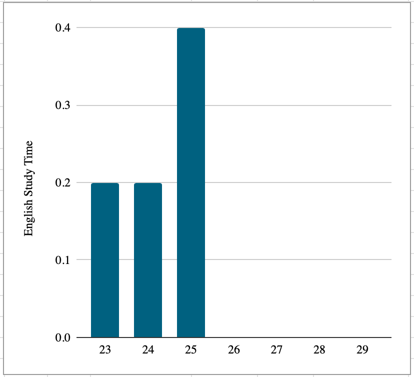 진짜 마지막이라고 생각하고 이렇게 해도 안되면 나는 영어와 더이상 연이 없는거라고 생각하며 손절하고 싶다. 그래서 5,000시간을 채우려고 도전하고 있다. 아직 첫번째 관문인 50시간에 이르지 못했다. 5,000시간을 채우기 전까지는 내가 충분히 노력을 하지 않았기 때문에 변명하지 않겠다. 더디지만 내 속도와 시간을 확인하면서 나 자신을 기다리려고 한다.