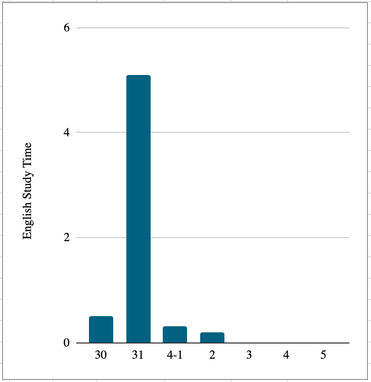 3월에 영어 공부했던 시간을 기록했던 그래프를 보면 후반부로 갈수록 공부시간이 늘어난 것처럼 보인다. 정확하게 말하면 착시효과이다. 한주에 1-2번 반짝 시간을 내서 공부했던 날들이 뒤로 갈수록 시간이 많아져서 그렇게 보일 수 있지만, 평균적인 날들을 보면 전혀 나아지지 않았다. 오히려 더 공부시간을 잘 확보하지 못한것처럼 보이기도 한다. 벼락치기하는 습관이 잘 고쳐지지 않는다.