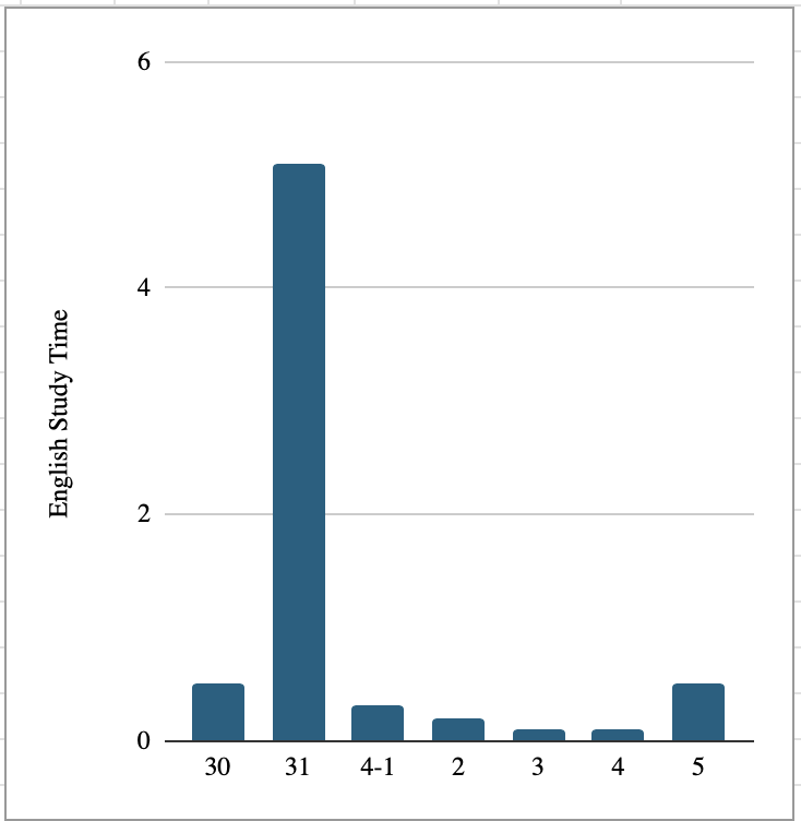 이번주는 영어 공부시간 목표를 15시간으로 평소보다 높게 세웠다. 월말이 있기 때문에 벼락치기로 집중하고, 새로운 한달을 시작하면서 열심히 할것이라고 다짐했기 때문이다. 하지만 목표로 했던 것 중에 절반 가까운 시간을 채웠다. 비록 목표에 이르지는 못했지만 그래도 계속 이어갔다는 점에서 절반 정도 성공으로 스스로를 격려했다.