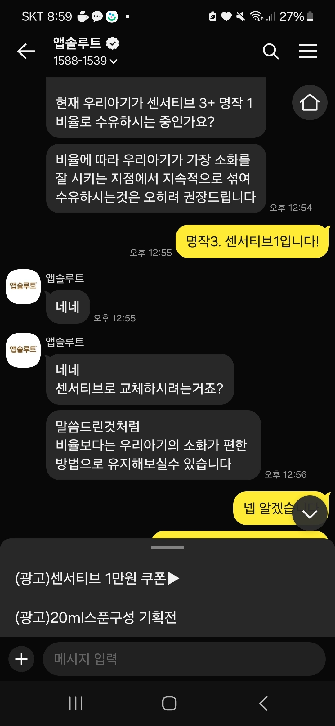 여러가지 리서칭을 해보니 앱솔루트 라인에 센서티브라는 분유가 잘 게워내거나 배앓이를 하는 아기들이 먹는다는 자료들을 발견했다. 효과를 본 후기들이 꽤 있어, 명작도 잘 먹으니 같은 라인도 괜찮을 듯 싶어 바로 구매했다.