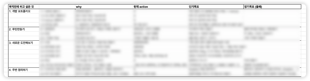총 4가지, 1) 개발, 2) 루틴 만들기, 3) 새로운 도전하기, 4) 주변 정리하기로 나누었다.
