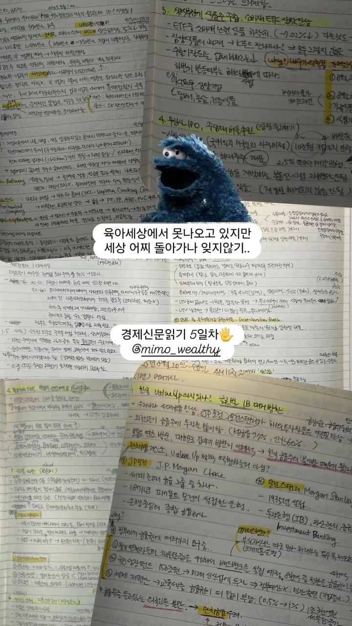 (3) 세상과 만나기도 단순하다. 현재 시장 팔로업하기 이다. 시작은 경제공부를 제대로 하고 싶다는 생각에서 스타트했다. 주말마다 주식강의를 듣고는 있지만 전문용어들이 아직 미숙하여 수업의 일부분만 이해하는 상황이 지속되었다. 그러던 중 올해 초에 시도했다가 포기했던.. 경제신문 읽기와 관련된 스터디 모집공고를 보게 되었고, 캐주얼한 마음으로 참여했다. 사실 누군가와 함께하면 완주를 잘한다는 나의 특성을 활용한 것도 있다. 9월부터 시작한 스터디는 지금까지도 이어지고 있다. 복직 후에는 스터디를 하진 않을 테지만 현재의 루틴을 이어나가려고 한다.
