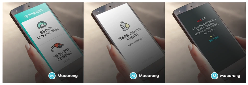 일이 바쁠 때는 햄버거 하나 급하게 먹을 수 있는 식당이 되어주고, 장거리 운전 시에는 무료 코인 노래방이 되어주기도 한다. 마카롱은 이런 고마운 내 차의 건강을 챙겨주는 고마운 어플이다.