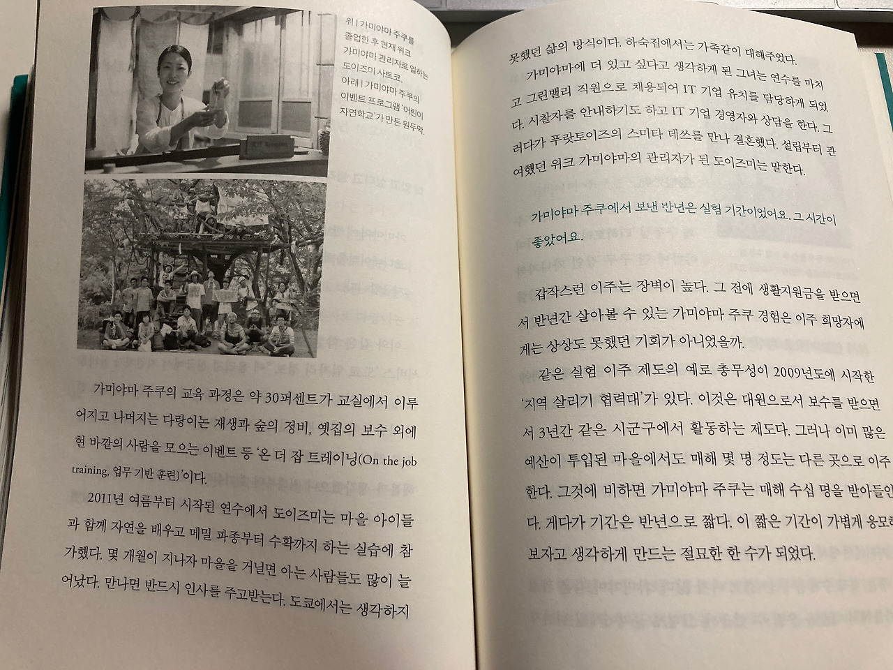 만나는 사람마다 개성이 넘쳤고, 어설픈 도쿄보다 자극을 주어 이런 시골이 있다는 사실에 깜짝 놀랐습니다. (중략) '우리 마을로 와주세요'라고 말하지 않는 것도 신선했습니다. 다른 곳에는 이주 희망자에 대해 '정착하실 거죠?'라는 무언의 압력이 있잖아요. 그러나 가미야마는 출입이 자유로운 분위기였고 그런 압력도 없었어요. 자신의 생각을 강요하지도 않고 사람과 거리감도 없고 그 따뜻한 배려가 느껴져서 최고라고 생각했습니다. (78-79쪽)