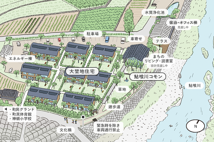 2014년 일본에서 대두된 소멸가능도시의 위기로 인해 면사무소는 '리전웍스(RegionWorks)'라는 지속가능한 개발을 위한 디자인 회사와 함께 지방재생 전략을 수립하게 되었다. 먼저 전략 수립 프로세스를 결정하는 방식에서는 행정인 면사무소 중심이 아닌 핵심 팀을 두고, 핵심 팀과 주민들, 면사무소 직원 대표 등과의 실무 집단을 결성했다. 이들은 여러 차례 회의를 통해 인구 감소와 함께 폐교, 세수 감소, 병원/상점/회사 폐업 등 다가올 미래를 분석하며 매력 있는 마을을 만들기 위한 과제와 아이디어를 도출했다. '멋진 마을 만들기', '교육, 학습', '먹거리', '에너지', '주거', '연결', '일자리 만들기' 일곱 개의 영역을 구분해 프로젝트별로 팀을 나눠 개별 시책 만들기를 시도했다. 특히 여기서 이러한 과제를 시행할 공사, 즉 공공 기업을 발족하기로 정했다. 이를 통해, 2016년 면이 1000만 엔을 출자해 일반 사단법인 '가미야마 연대공사'가 설립되었다. 지역주민들이 중심이 되고 면사무소가 중개자가 되어 지원하는 방식이다. 현재 가미야마 마을에서는 '마을을 미래 세대에 이어주는 프로젝트'인 연결 프로젝트를 다양하게 시도하고 있다.