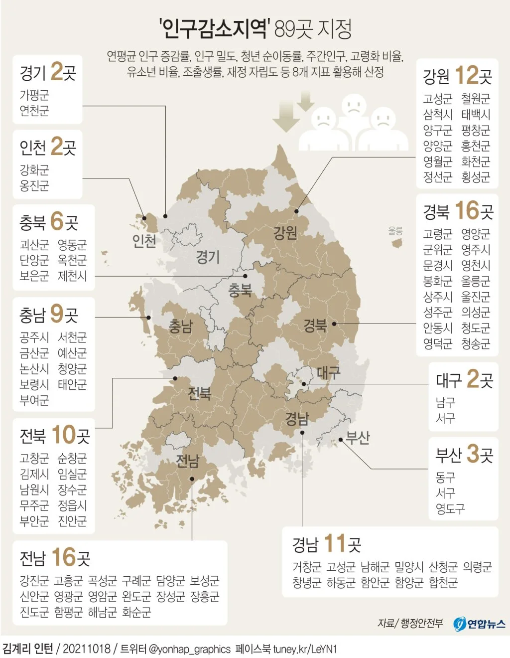 *(8개 지표) 연평균인구증감률, 인구밀도, 청년순이동률, 주간인구, 고령화비율, 유소년비율, 조출생률, 재정자립도(행정안전부, 2021.10.18)