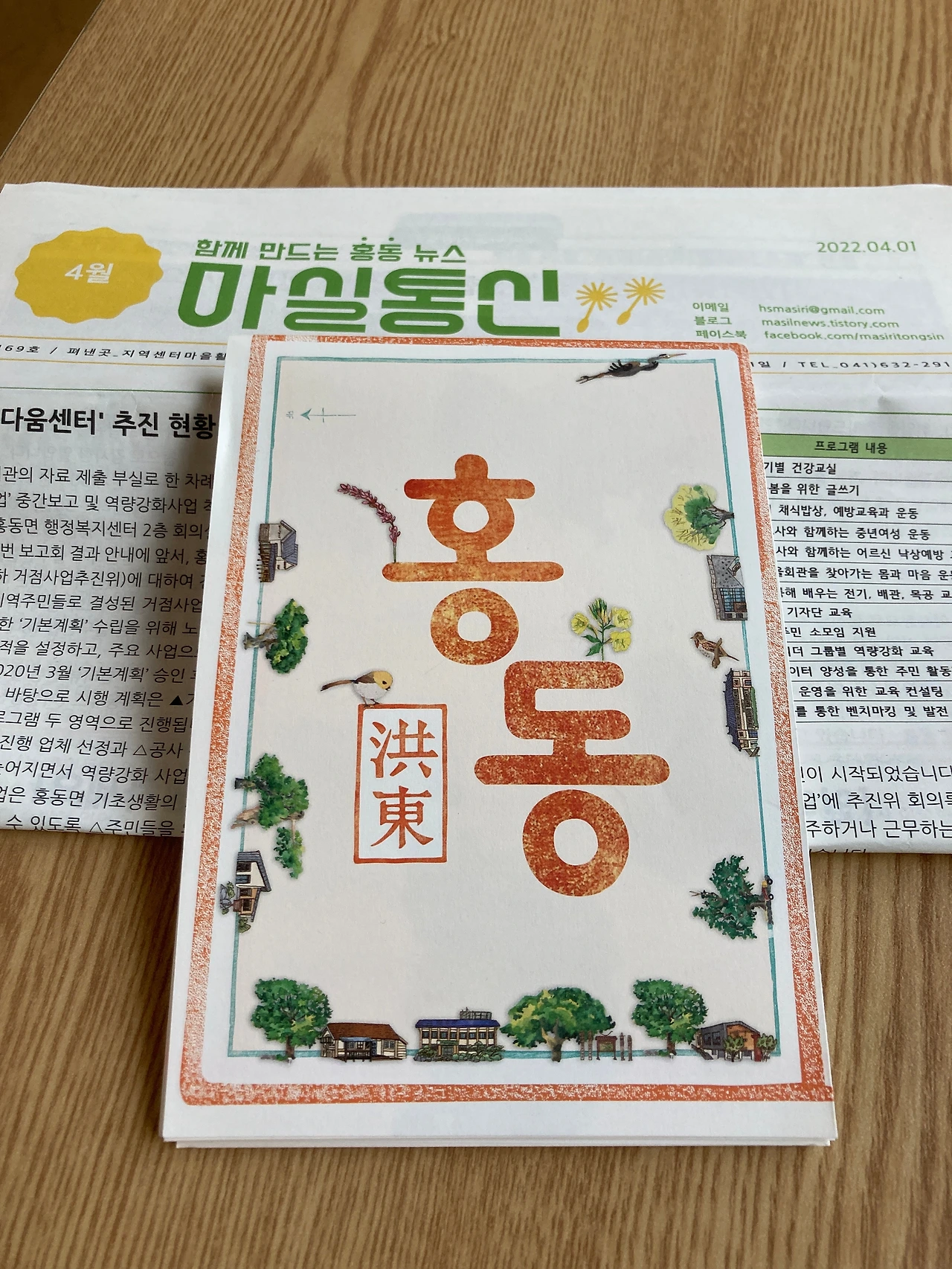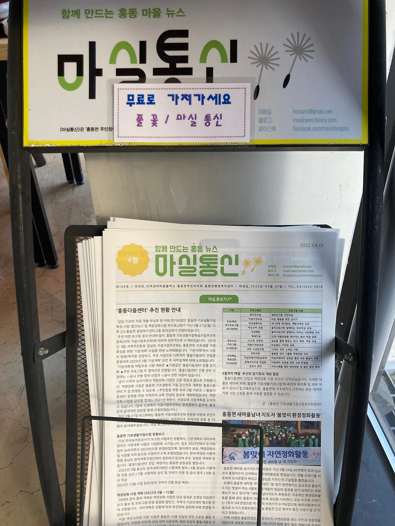 4월 말 주말에 충청남도 홍성군 홍동마을을 다녀왔다. 이번 답사는 농촌 지역 공동체에 대한 활동을 이해하고 이 마을의 제3의 장소를 찾아 나섰다. 잠깐 들린 방앗간 옆 카페에서 마을 소식을 담는 '마실통신'을 발견했다. 마실통신에는 홍동면에서 진행되는 다양한 활동과 주민의 이야기가 담겨있었다. 홍동면 행정복지센터의 소식 뿐만 아니라 마을기자들이 주민들의 일상을 엿볼 수 있는데, 굴삭기로 밭을 일구는 어르신, 코로나로 인해 경로당을 쓸 수 없어서 댁에서 꽃그림 색칠놀이를 하는 어르신의 모습을 만났다.