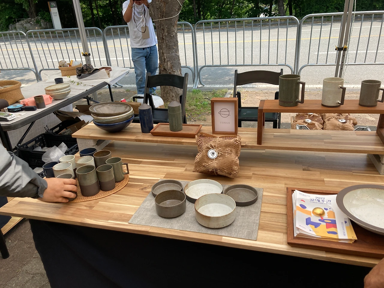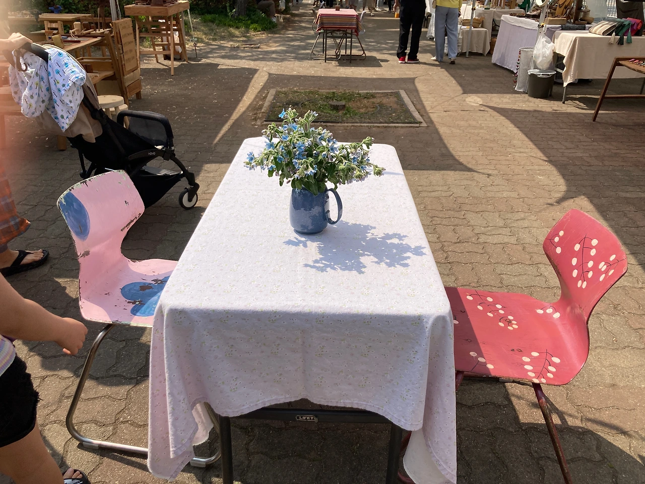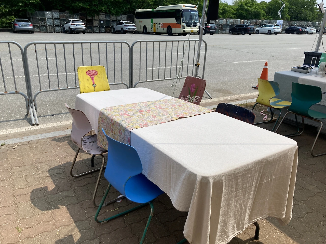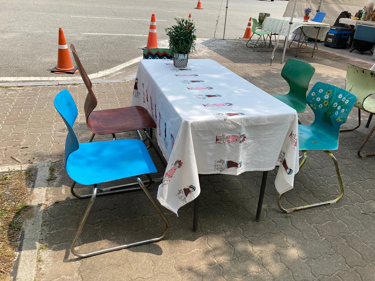 우리는 이곳 리버마켓을 천천히 둘러본다. 어느 하나 급한 것이 없다. 판매대가 일직선으로 늘어진 곳을 걷기도 하고 도자박물관으로 향하는 넓고 열린 곳을 걷기도 한다. 걷다 보면 앉아있고 싶을 때도 있는데, 곳곳에 잠시 쉴 수 있는 공간들이 마련되어 있다. 쉬어가기도 좋고 보기에도 예쁜 테이블과 의자는 작가들이 직접 화분과 그림을 올려놓고 테이블보를 깔아 놓는다. 각자 특성이 묻어나 보기에도 즐겁다.