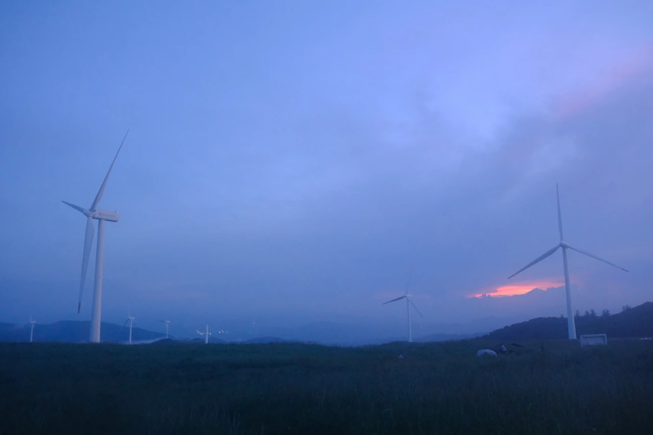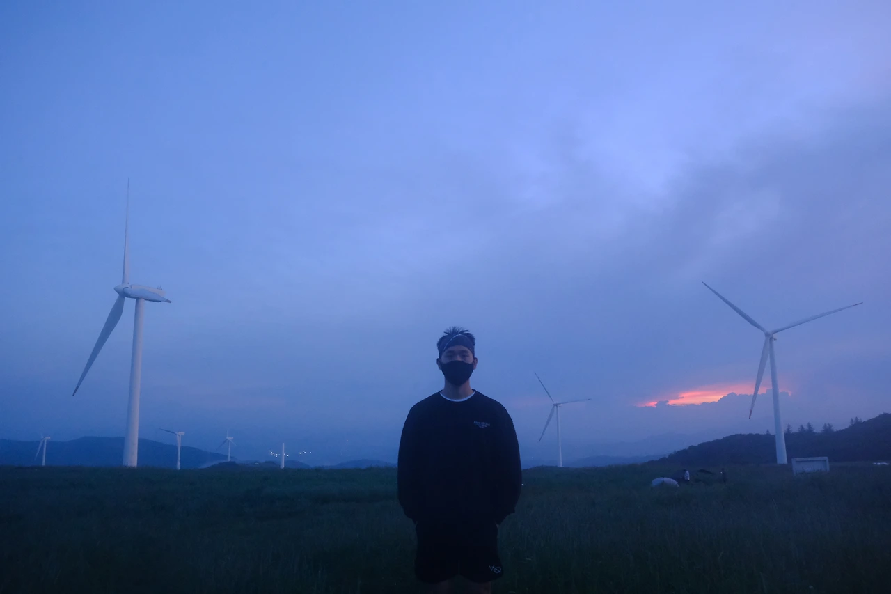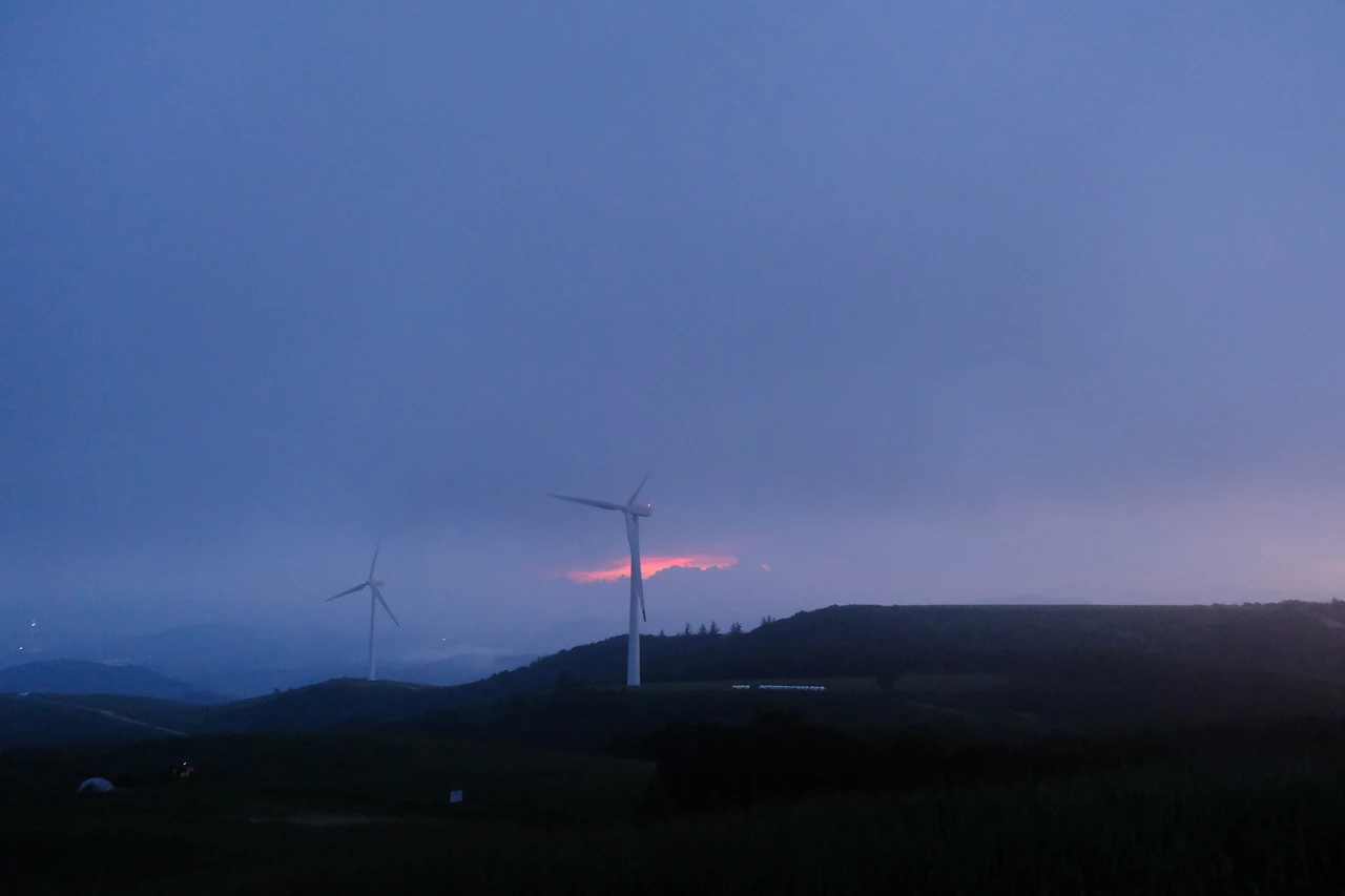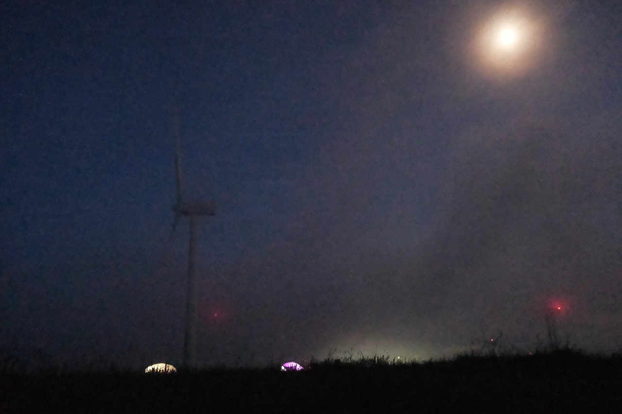 하지만, 찰나의 순간이었다. 안개 속에서 풍력발전기가 거대한 모습을 드러냈다. 생각보다 매우 가까이 있었다. 습기 때문에 카메라를 꺼낼 생각도 못하고 있었던터라 부랴부랴 삼각대를 들고 초원으로 달려갔다.