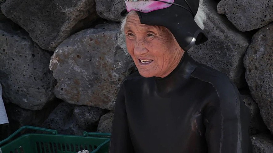 영화 속 출연자였던 고창선 해녀는 늘 그랬듯 물에 들어갔다가 물숨을 이기지 못하고 죽음을 맞는다. 그녀의 딸 강덕희 해녀는 엄마를 보내고 얼마 지나지 않아 다시 바다로 향한다. 해녀인 딸은 엄마의 죽음을 담대하게 받아들인다. 해녀는 살기 위해 들어간 바다가 무덤이 된다는 사실을 누구보다 잘 알고 있기 때문이다. 제주도에 해녀들이 실제로 그러하다. 남편을 묻고, 딸이 묻힌 그 바다에 또다시 물질을 하러 들어간다. 먹고살기 위해, 이승에 남은 다른 가족들을 위해, 죽음을 품은 삶의 터전에서 힘차게 물질을 한다. 해녀에게 바다란 그런 곳이다. 자신의 딸을 묻은 바다를 그저 멀멀하게 바라보는 늙은 해녀의 쇼트는 죽음에 대한 해녀의 해탈을 직관적으로 나타낸다.