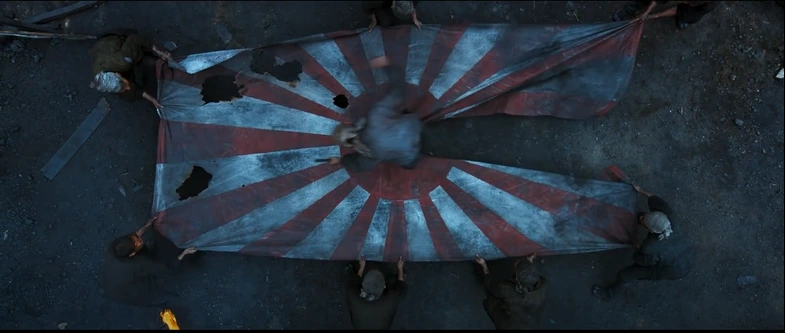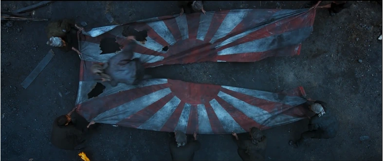 이러한 상징성이 담긴 욱일기가 반으로 찢긴다. 구체적으로 살펴보면 하나의 숏 안에 피사체인 욱일기와 인물들이 들어온다. 가변적인 시간에 맞춰 접혀있던 욱일기는 인물들의 움직임으로 넓게 펼쳐진다. 특정한 인물이 도구를 이용하여 욱일기를 가로질러 가면서 절단한다. 욱일기는 반으로 잘려 땅바닥에 떨어진다. 이때 카메라는 펼쳐진 욱일기를 클로즈업하여 보여주다가, 누군가의 절단이 시작되자 위로 패닝 하여 욱일기를 잡고 있던 인물들까지 드러나게 보여준다.
