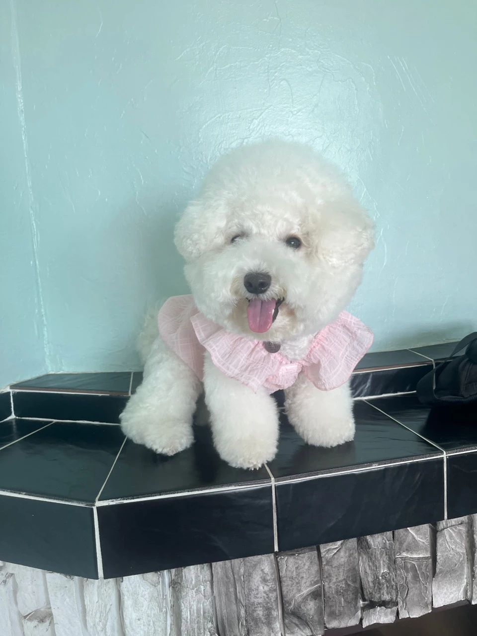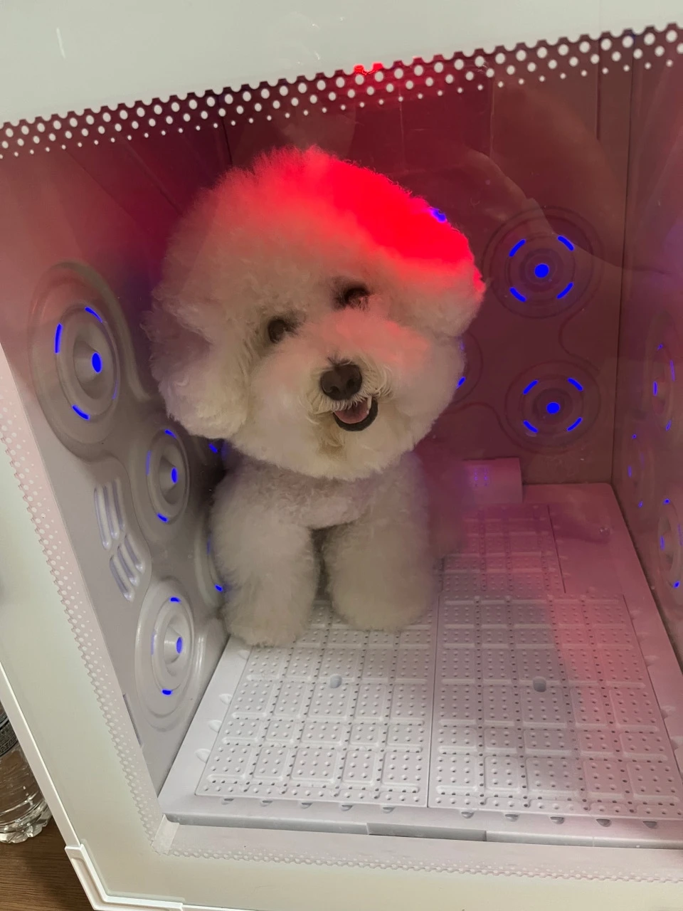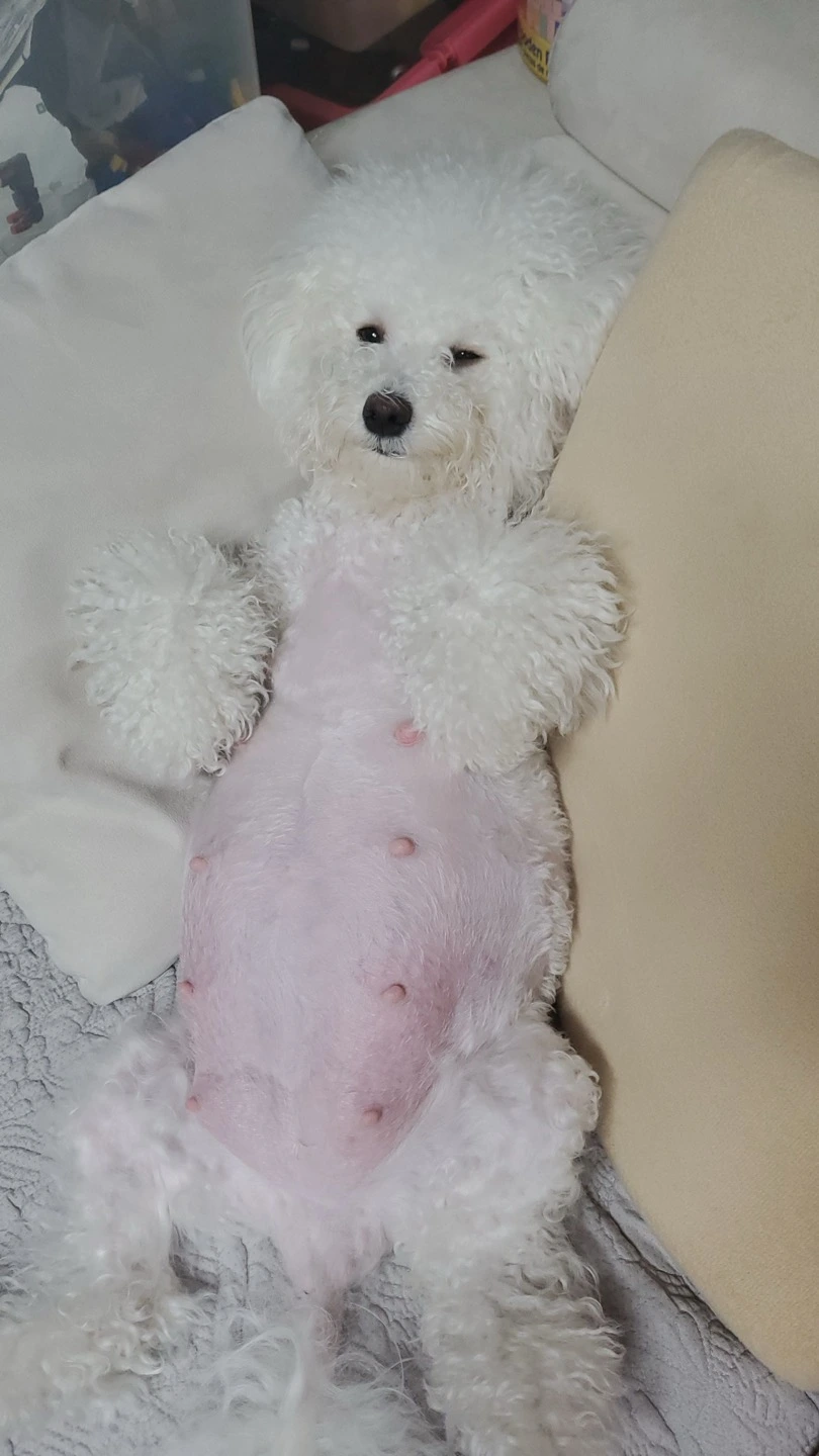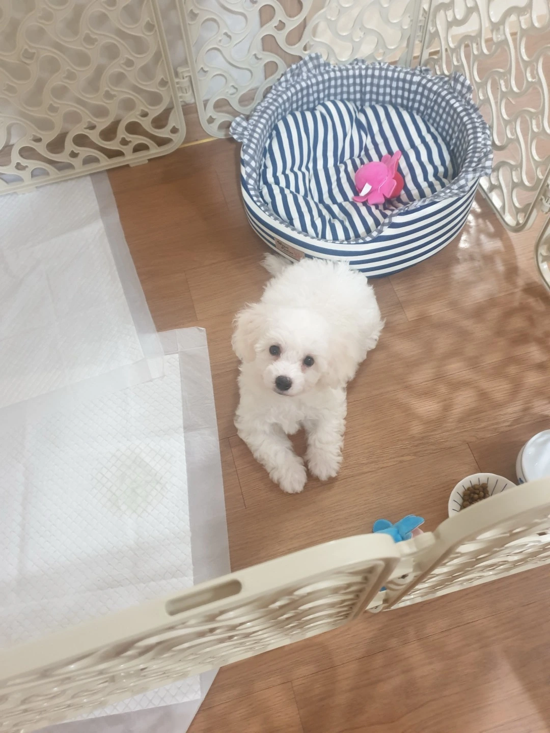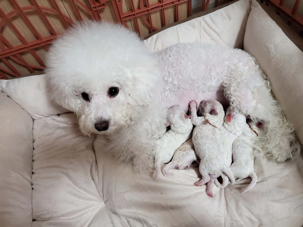 여동생 집에는 토토와 같은 비숑 수컷 두부도 있었어요. 여동생은 비숑 가족을 키우고 싶었나 봅니다. 그 두부가 첫 생리를 한 토토를 임신시켰어요. 토토와 두부를 분리시켰는데 철창을 뚫고 두부가 토토를 임신시켰다고 해요.