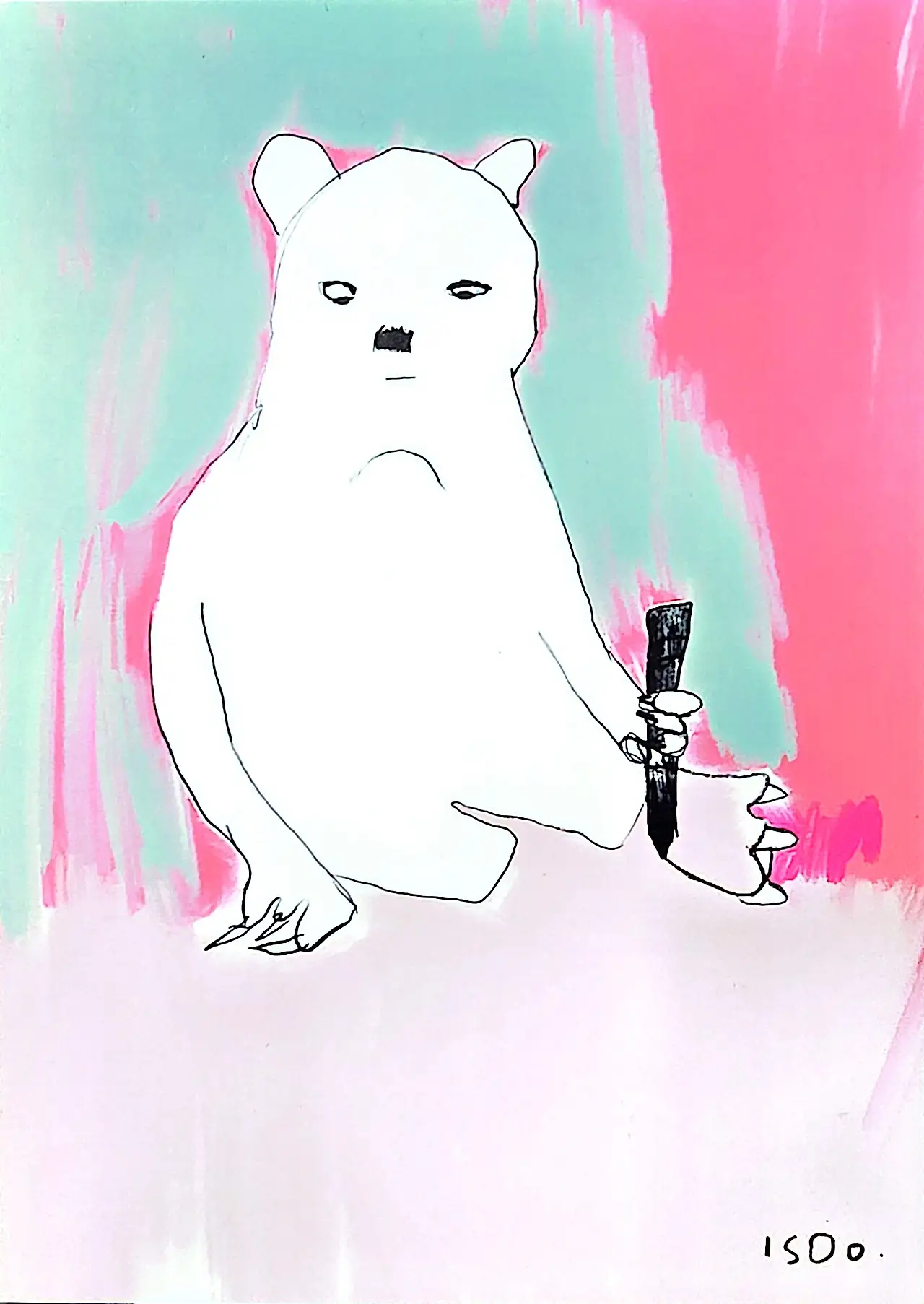 바닥에다 펜으로 발을 그리고 있는 곰……