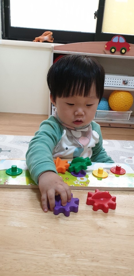 모양 끼워 맞추기나 블럭 쌓기도 제법 늘었다. 별, 하트, 동그라미 모양 퍼즐을 제 위치에 넣거나 커다란 아기용 종이 블럭을 크기 순으로 쌓는 건데 16개월 전까진 해 볼 생각을 안해 '아 이것도 느리게 하려나' 싶었는데 16개월이 넘어가니 굳이 시키지 않아도 찾아서 하고 있다. 물론 같은 모양에 끼워넣기 보다 다른 모양에 꾸겨넣기를 더 좋아하고 블럭을 쌓는 것보단 엄마가 쌓은 것을 무너뜨리는 것을 더 즐겨하지만.