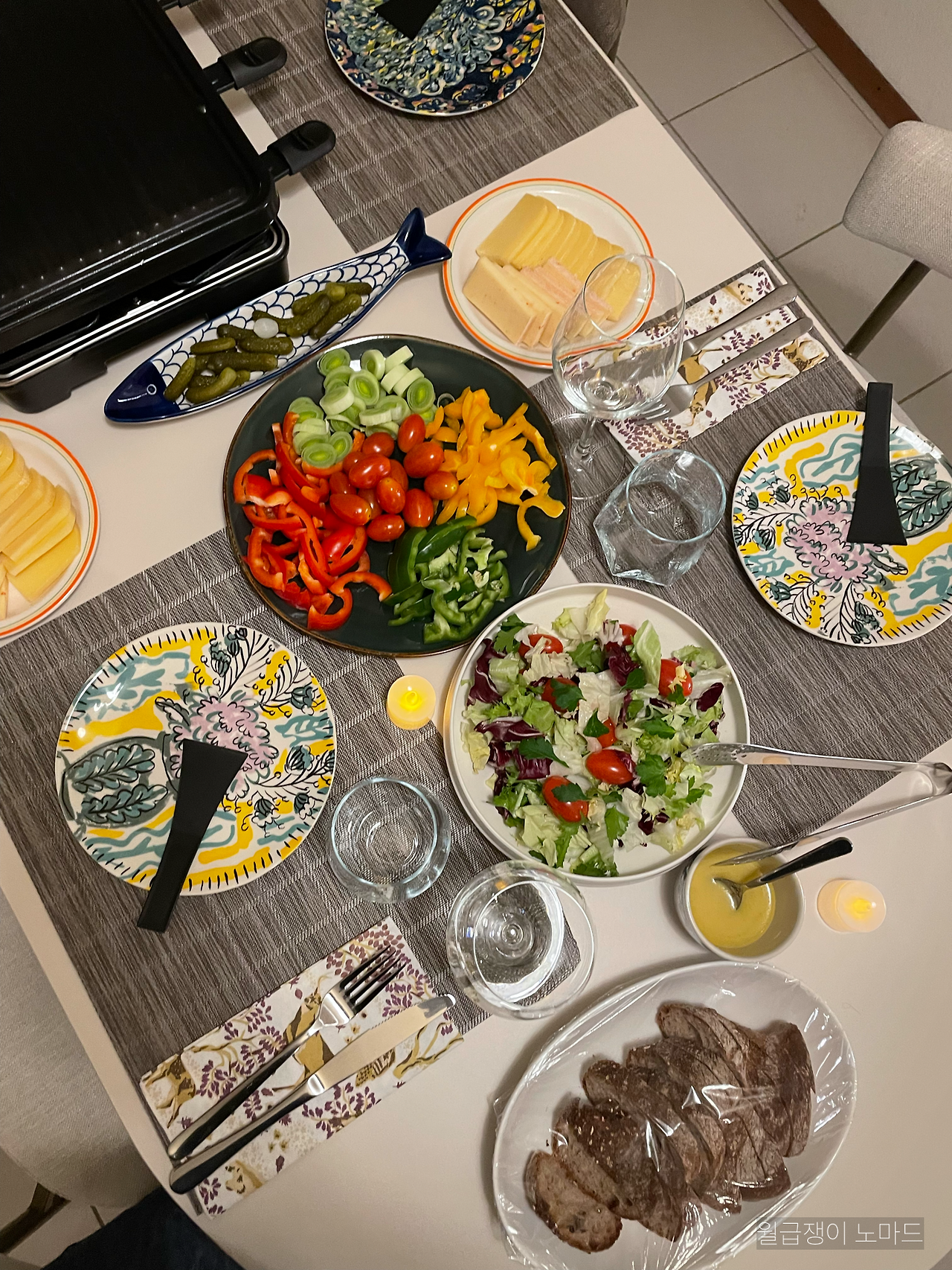 그럼에도 불구하고 열심히 스위스 음식을 탐험하고 있다. 노마드로 살면서 정착지의 음식을 맛보는 건 늘 새로우니까 말이다. 올 겨울에는 라끌렛 기계를 집에 들였다. 네모난 치즈를 작은 팬에 녹여서 감자, 빵, 구운 채소 위에 올려 먹는데 치즈를 녹여먹는 재미가 있다. 그리고 집에서 먹으니 확실히 가격도 합리적이다. 여러 채소와 샐러드 재료 이것저것 사면 10프랑, 치즈 4인분 20프랑, 빵 5프랑, 와인 15-20프랑이면 4명이 배부르게 즐길 수 있다.