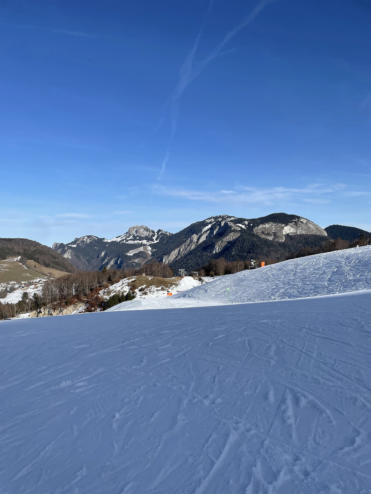 망설였던게 무색할만큼 스키장으로 가는길은 아름다웠고 고도를 높일수록 햇살도 더 따스해졌다. 스키를 렌탈샵에서 갈아신고 리프트를 타고 올라가는데 장관이었다. 어제 저녁에 살짝 눈이 왔는지 설질도 좋아서 나같은 초보가 타기에 폭신했고 넘어져도 아프지 않았다. 점차 스키 실력이 늘면서 그래도 풍경을 즐기면서 탈 정도가 되었다. 완만한 직선코스를 타면서 아름다운 설산을 눈에 담았다. 바람을 가르면서 달리는 기분이 좋았고 꿀꿀하던 기분도 나아졌다. 그리고 생각했다. 집밖으로 나오길 잘했구나. 울어도 알프스를 보면서 우는게 낫구나.