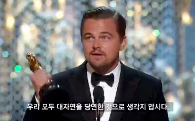 예전 2016년 제88회 아카데미 시상식에서 6번째 노미네이션 끝에 영화 레버넌트(The Revenant)로 드디어 남우주연상을 수상한 레오나르도 디카프리오가 수상소감을 밝히면서 "이 지구를 당연하게 생각하지 맙시다. 나도 오늘 밤을 당연시하지 않겠습니다(Let us not take this planet for granted. I do not take tonight for granted)."라고 이야기한 적이 있었다.