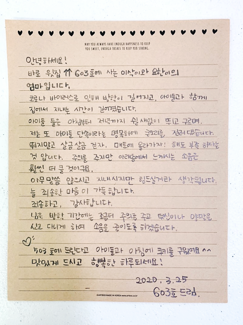 코로나 집콕으로 발생되는 층간소음에 대해 아랫집에 죄송한 마음을 담아 인사를 드렸다고 한다.