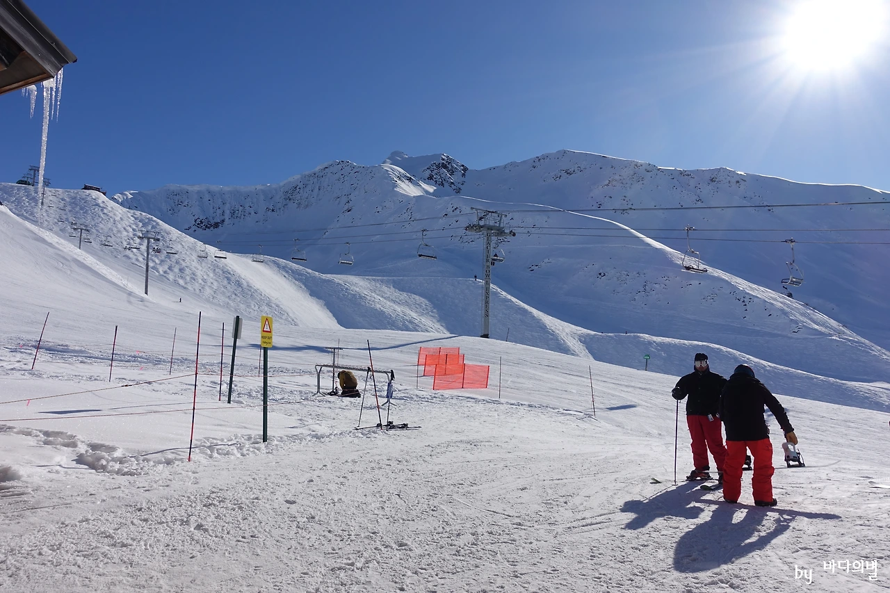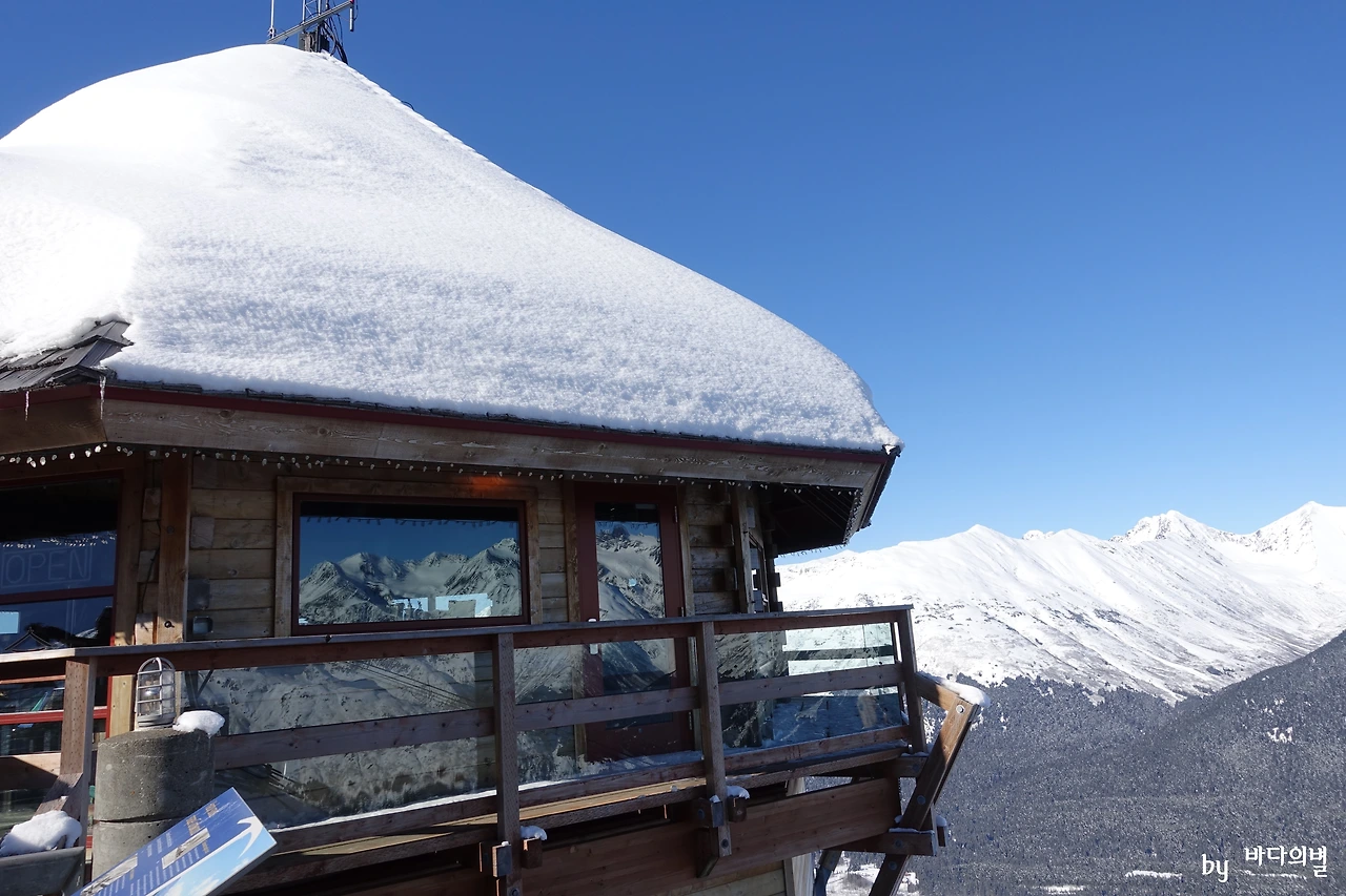 올라와보니 멀리 있는 산들까지, 산맥이 한눈에 보였다. 구름 한 점 없는 탁 트인 하늘은 설산을 더욱 돋보이게 했다. 스키를 타지도 않으면서 여기서 스키 타면 너무나 행복하겠다고 생각했다.