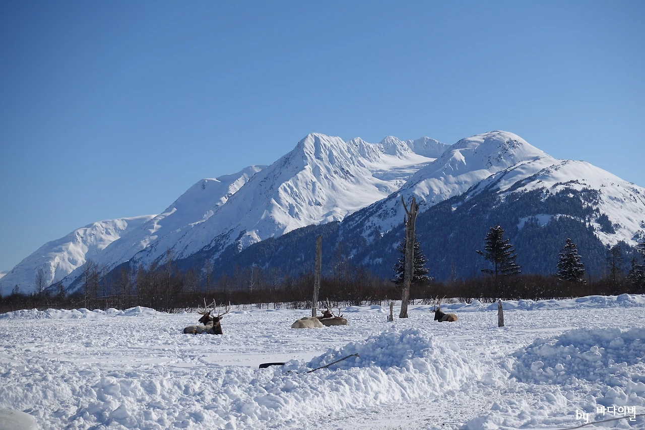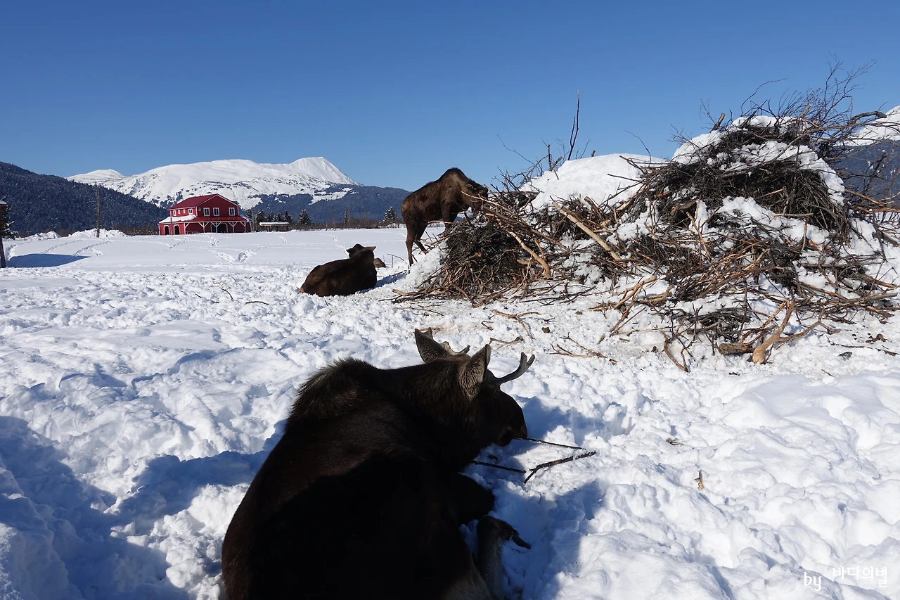 알래스카에서 많이 볼 수 있는 무스들. 무스들의 뿔은 매년 떨어진다. 봄과 여름에 자라고 가을 이후에는 떨어지고, 봄이 오면 다시 새로 자란다고 한다. 그래서 이렇게 뭉툭한 흔적만이 보이기도 했다.
