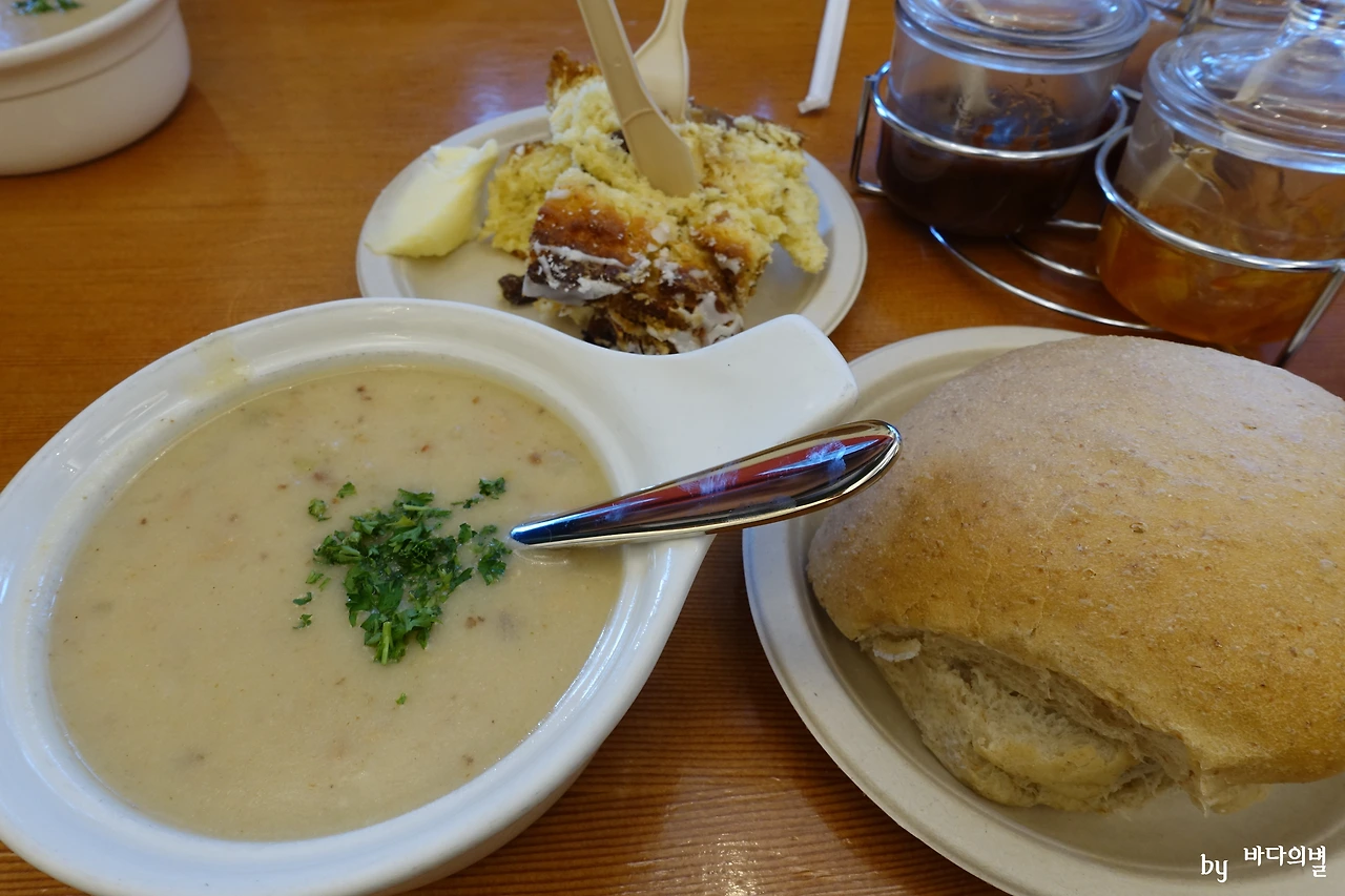 대부분 투어사에서 데려가는 식사 장소는 별로인데, 이날 간 곳은 정말 맛있는 클램 차우더와 버터 바른 빵, 그리고 달달한 시나몬 번까지 주는 아기자기한 식당이었다.