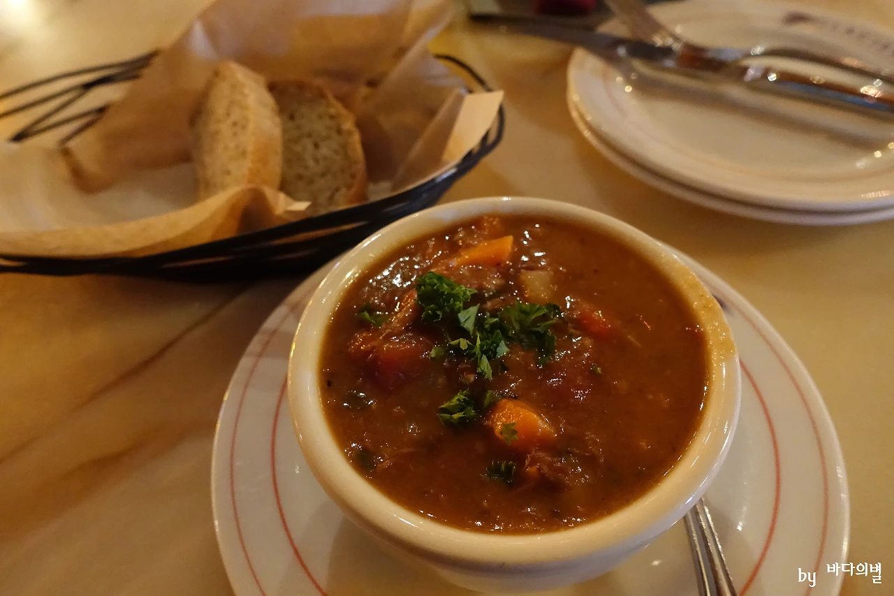 뜨끈한 것이 먹고 싶어 비프 수프도 같이 주문했는데, 기대 없이 한 숟갈 떴다가 감탄했다. 결국 싹싹 비워서 다 먹고, 아플 땐 단 걸 먹어야 한다며 후식으로는 찐뜩하고 굉장히 단 피넛버터 파이까지 싹 비웠다. 참 신기하게도 오후부터는 좀 나아진 느낌이었다.