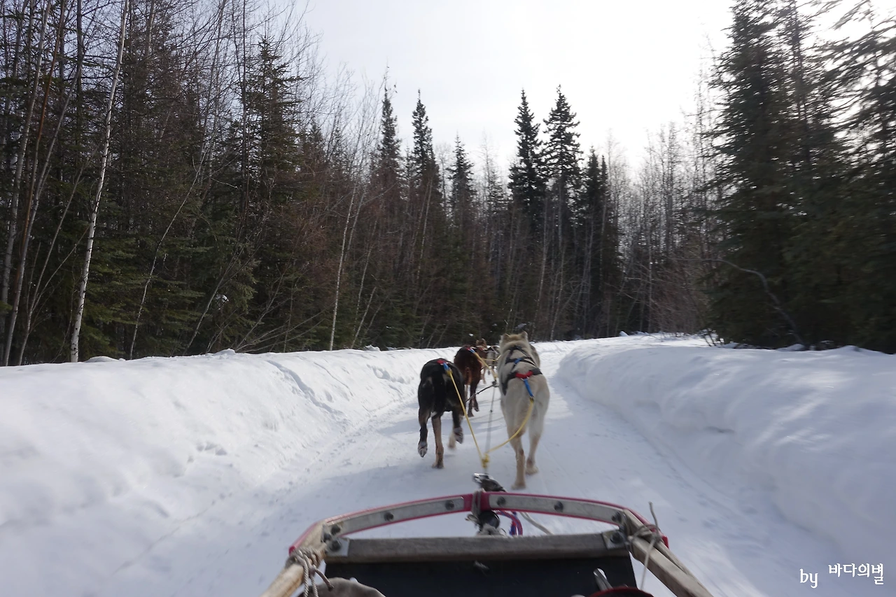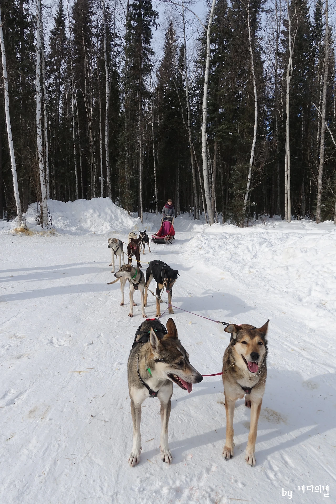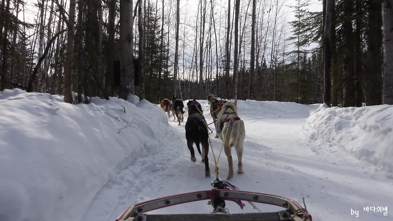 나이가 든 개들이라고 해서 그렇게까지 빠르지 않을 줄 알았는데, 역시 경주개 출신들이라 정말 빨랐다. 여러 마리가 한 번에 박자가 맞는 것도 신기했다. 정말 오랜 시간 호되게 훈련을 했기 때문에 가능한 것이겠지. 그렇게 생각하면 또 한 번 마음이 아팠지만, 알래스카만의 문화이니 어느 정도는 이해하기로 했다.