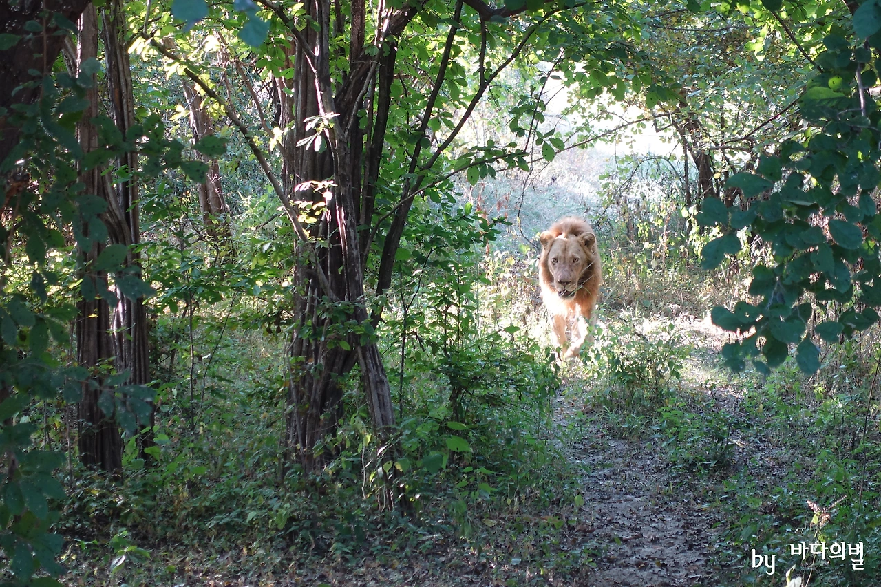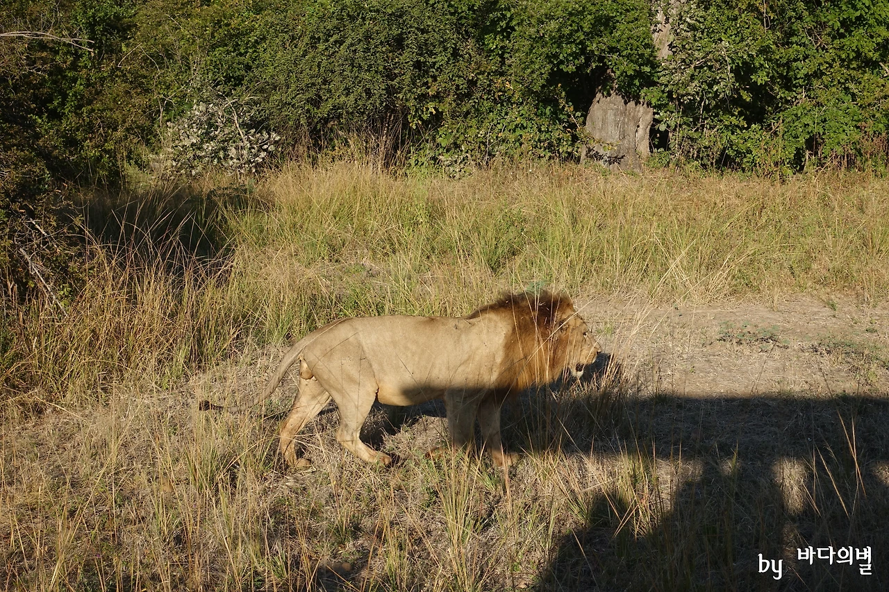 차를 타고 사자들이 갔을 법한 길목으로 가보니, 숲 속에서 수사자가 걸어 나오고 있었다.