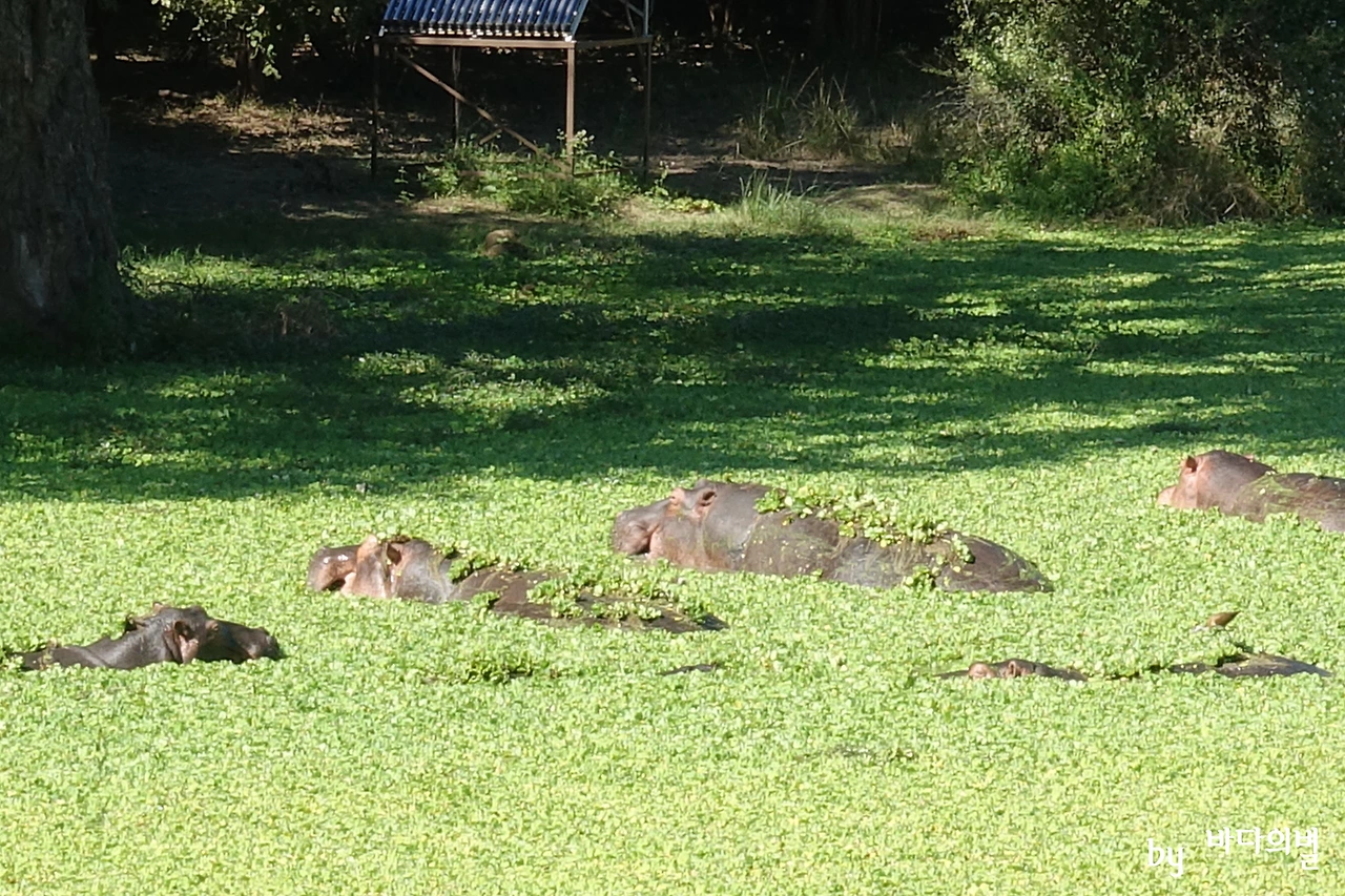 다리를 건너는데, 아래 물속에서 헤엄치고 있는 하마 두 마리를 발견했다. 하마는 여태껏 제대로 보지 못해 늘 아쉬웠던 동물인데, 이날만큼은 달랐다.