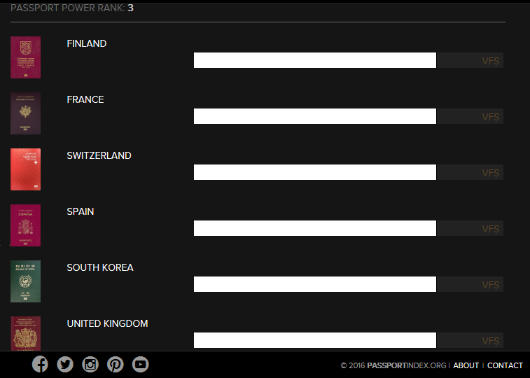 이곳은 Passport Index라는 사이트인데, 우리나라가 여권 순위 공동 3위에 있다. 1위는 독일, 2위는 스웨덴이었다. 우리나라가 복지 수준이나 경제 수준은 못 따라잡아도 여권 수준은 핀란드, 스위스와 거의 동급이란다.