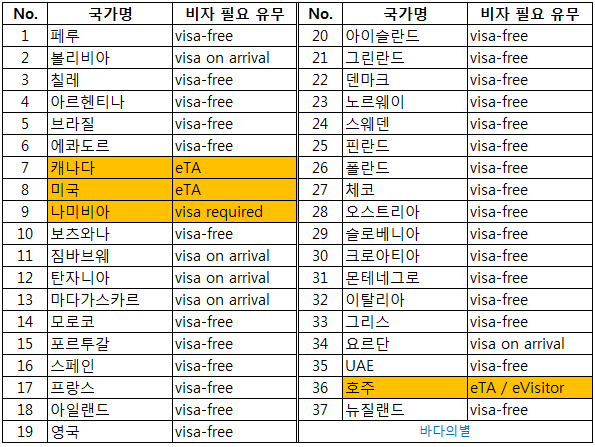 내가 가고자 하는 국가들을 찾아보니, 색으로 표시한 곳들 외에는 미리 준비할 필요가 없었다. 사실상 미국, 캐나다, 호주의 경우 여행 허가 신청이니, 공식적으로 비자를 발급받아야 할 곳은 나미비아뿐! 물론, 우리나라에 대사관 조차 없는 나미비아는 비자받기가 까다롭고 시간이 오래 걸린다고 한다. 그렇지만 신경 쓸 곳이 나미비아 한 곳이니 참으로 다행이다.