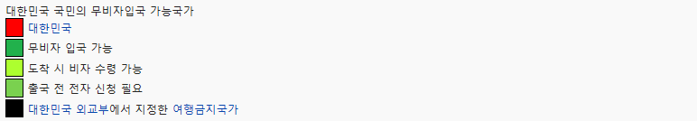 위키피디아에서 발견한 지도이다. 짙은 초록색이 가득하다. 무비자로 입국이 가능하다는 뜻이다. 이중 미국, 캐나다, 호주의 경우 온라인으로 여행 허가 신청(비자 면제 신청)을 해야 한다. 그래야만 무비자로 입국이 가능하다. 심지어 미국/캐나다는 (호주는 잘 모르겠다) 경유 만으로도 신청해두어야 한다고 하니, 목적지가 미국/캐나다가 아니더라도 경유지가 포함되어 있다면 미리 잊지 말고 신청해야 할 것이다.