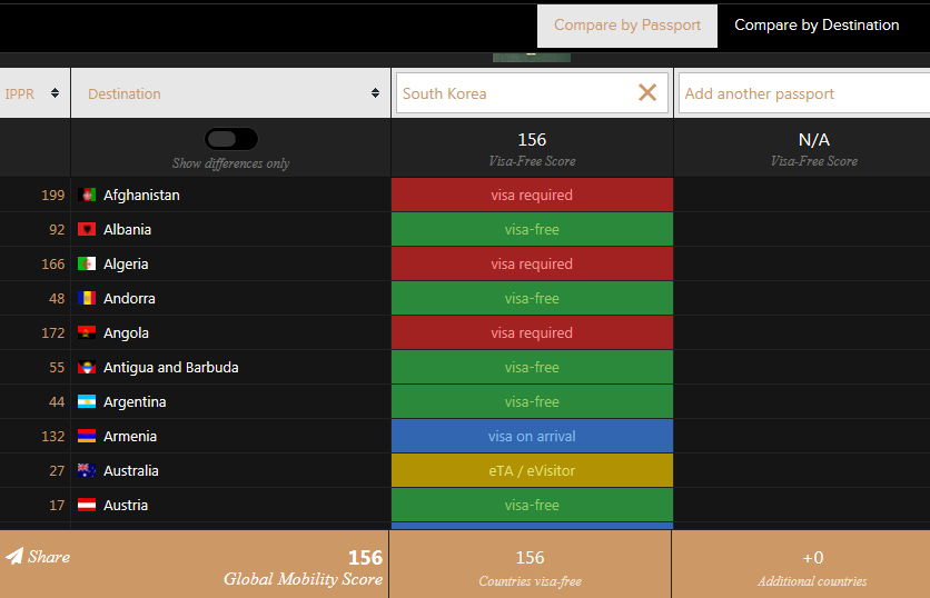 이 사이트에서는 여권 별로, 어떤 국가에 갈 때 비자가 필요하고 어떤 국가에는 필요가 없는지 리스트로 한 번에 볼 수 있게 해놨다. 2~3가지 여권을 한 번에 검색해서 볼 수도 있고, 국가별로도 어떤 여권은 비자가 필요하고 어떤 여권은 필요 없는지도 볼 수는 있는데, 나한테는 별로 필요하지 않은 기능이다. 국제 커플의 경우 편할 수도 있겠다.