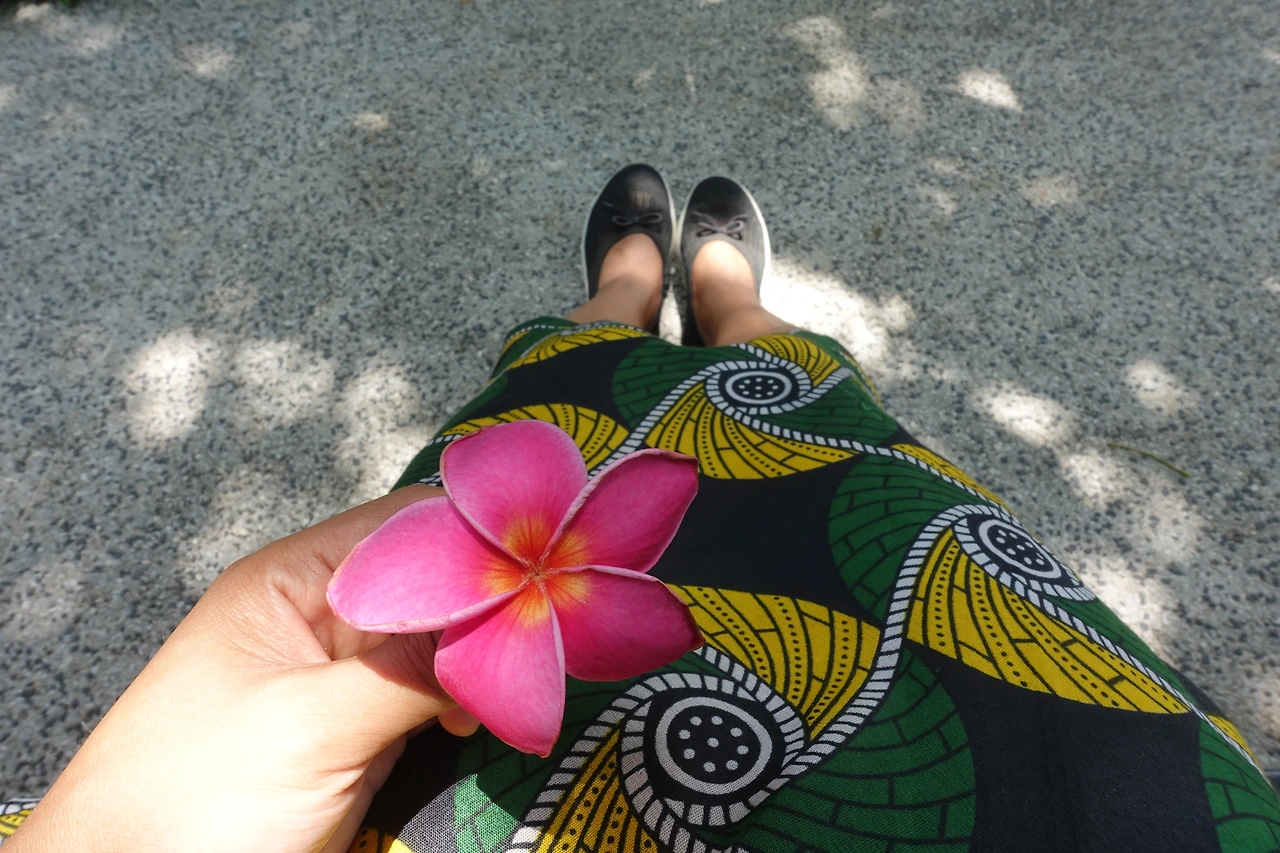 길 건너에는 작은 공원 같은 것이 있어서 나무 그늘 아래서 잠시 쉬었다. 벤치에는 꽃 한 송이가 떨어져 있었다. 진한 분홍색의 푸루메리아(프랜지패니, Frangipani) 꽃은 나의 아프리카 스커트와 왠지 잘 어울렸다. 이날도 길거리에서 한 유럽계로 보이는 여자가 스커트 너무 예쁘다고 칭찬해주고 갔다.
