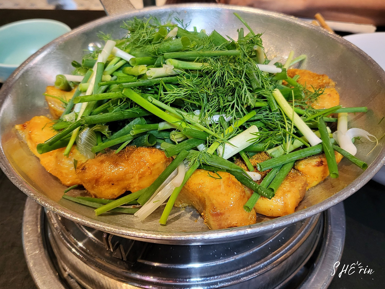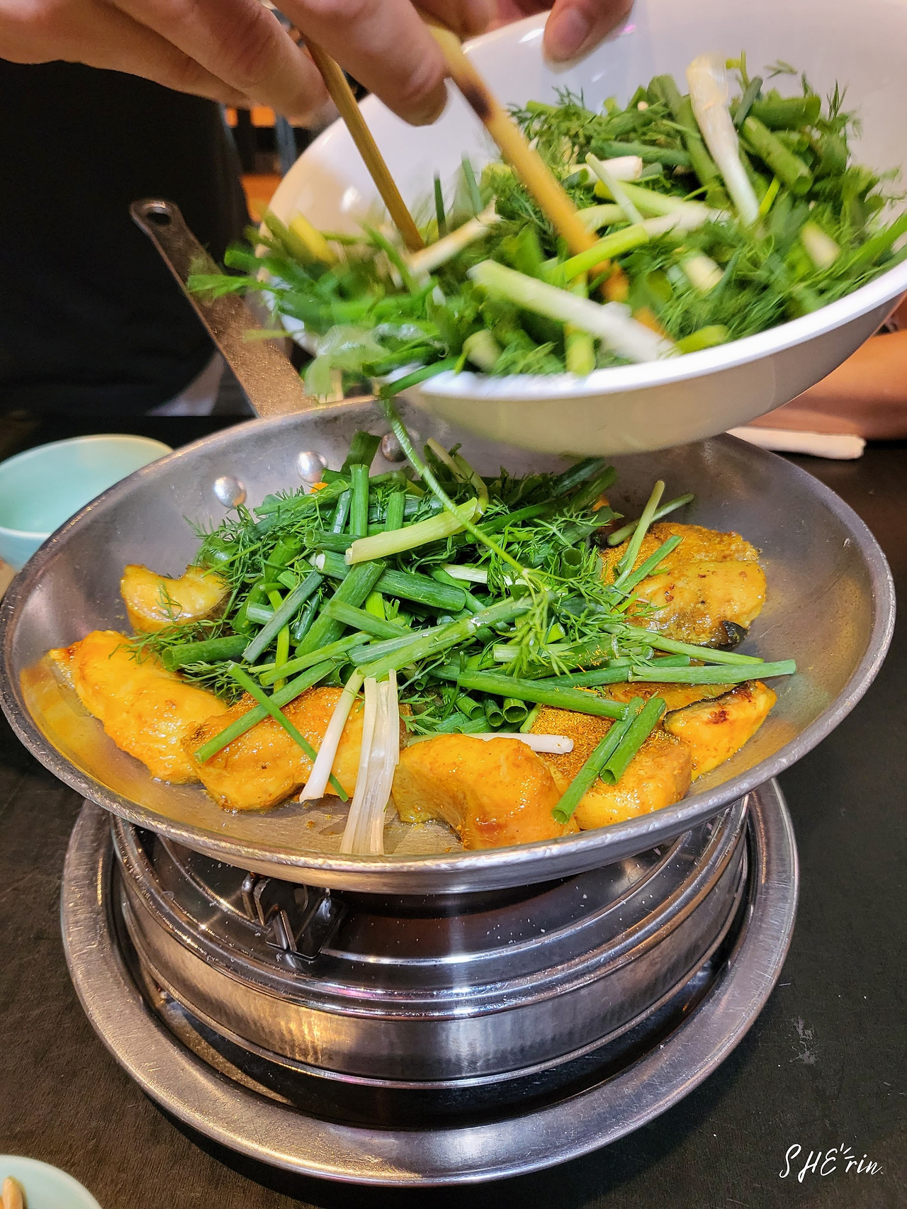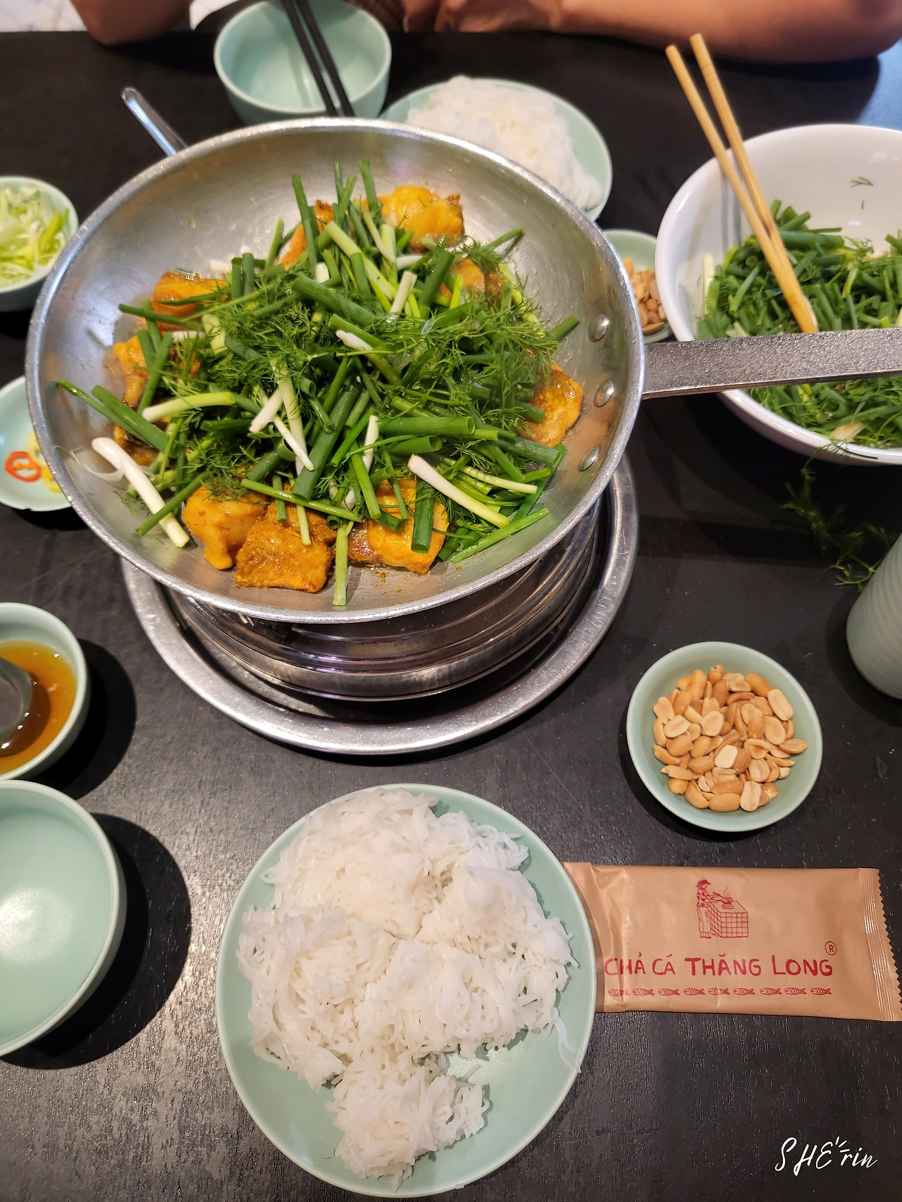 주문하고 잠시 뒤, 팬 위에 가물치 튀김과 채소를 함께 볶아주면서 나왔다. 그리고는 곧이어 함께 곁들여 먹을 쌀국수 면과 피시소스, 허브, 파, 땅콩 등이 테이블에 차려졌다. 세트 메뉴에 포함된 스프링롤도 두 개씩 나온다. 1인당 2개라 총 4개가 나왔다. 직원은 친절하게 먹는 방법도 알려주었는데, 가물치 튀김과 함께 볶아진 채소를 국수 위에 얹고, 나머지 것들을 적당히 함께 올려 곁들여먹으면 된다.