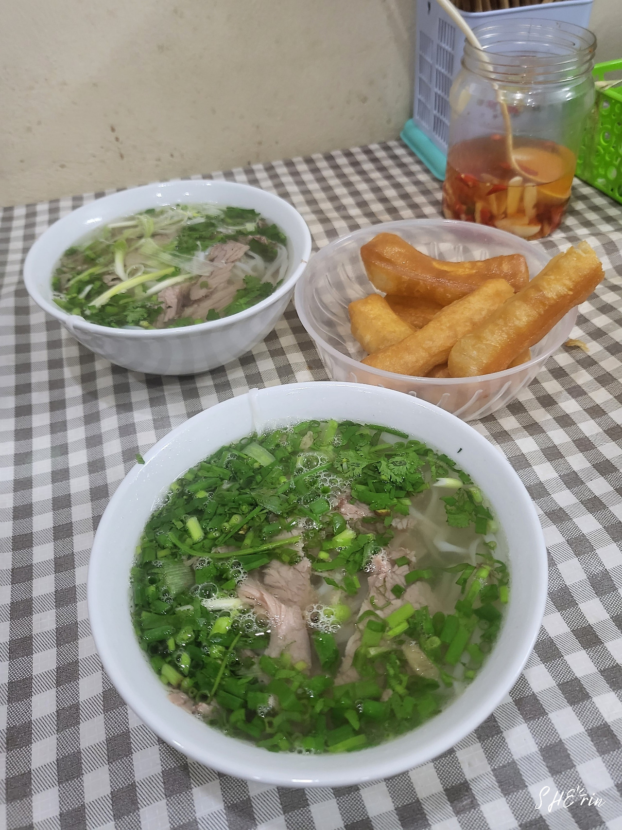 조금 기다리니 밀가루 튀김빵인 꿔이가 먼저 나왔다. 꿔이는 그냥 먹어도 되지만 쌀국수에 찍어 먹으라고 주는 빵이다. 특별한 맛은 없지만 쌀국수에 넣어먹다 보면 또 은은한 중독성이 있다.