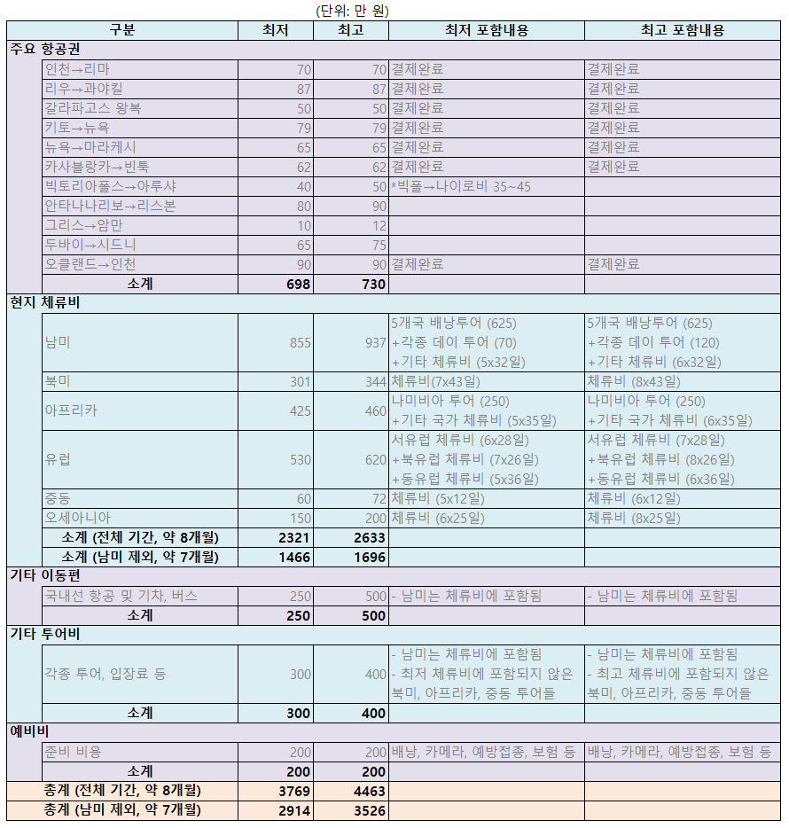 그래서 8개월 간의 예상 경비는 약 3,800~4,500만 원이고, 남미 여행이 특히 비싼 관계로 남미를 제외하고 계산하면 7개월 간의 예상 경비는 약 2,900~3,500만 원이다. (실제로는 남미의 경우 엄마까지 2명분의 비용이 들었으나, 여기서는 1명 기준으로만 예상해서 계산했다.)