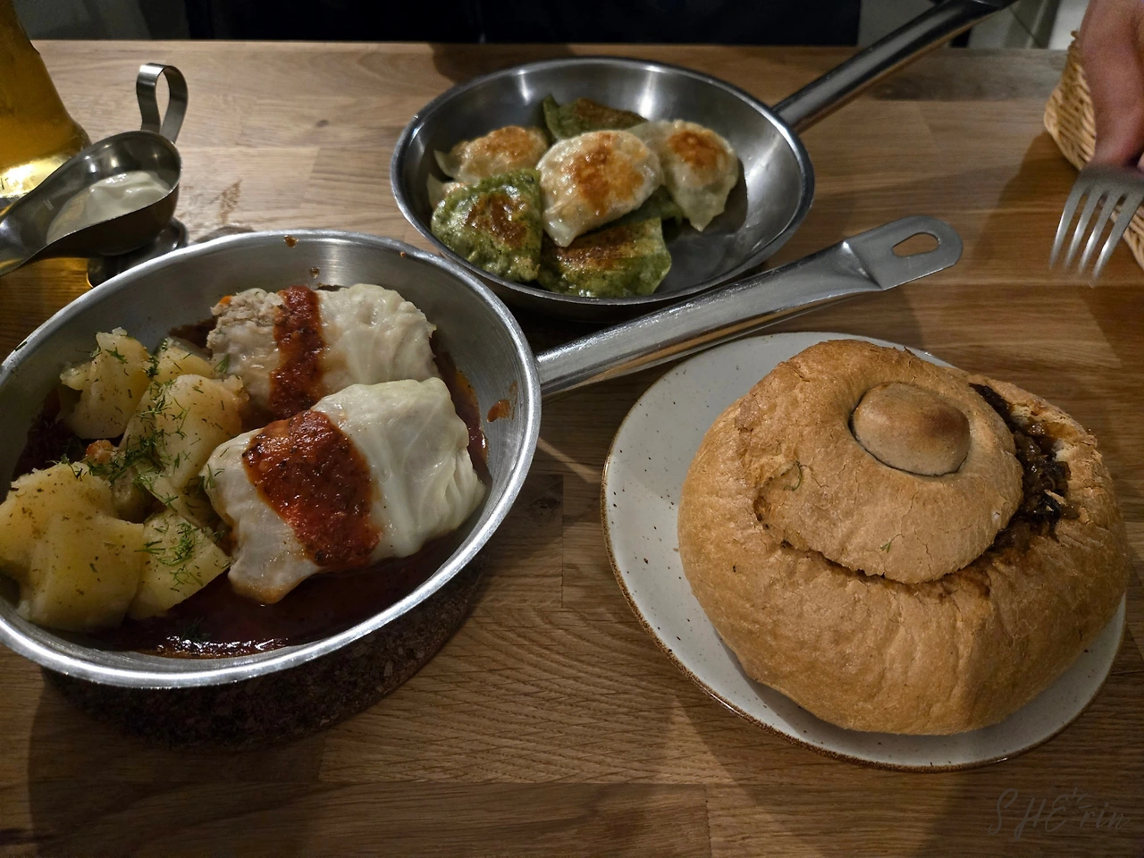 찐 것과 구운 것 중 우리는 군만두 형태의 피에로기를 선택했다. 버섯이 들어간 것 반, 시금치가 들어간 것 반으로 주문했는데, 속도 촉촉하고 알찼지만 만두피가 쫀득해서 더 맛있었다. 사이드로 준 사워크림과의 조화도 완벽했다. 아빠가 맛을 잘 선택한 것일까? 아니면 이 식당이 유독 맛있었던 것일까? 7년 전에도 비슷한 메뉴들을 주문했었던 것 같은데, 기억 속 피에로기와는 딴판이었다.