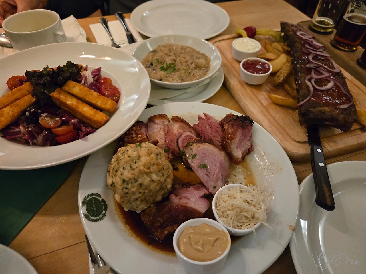 추위에 떨다 들어와서인지, 가장 먼저 눈에 띈 메뉴는 역시 갈릭수프였다. 뜨끈한 수프로 먼저 몸을 녹인 뒤, 본격적으로 오스트리아 첫 식사를 시작했다. 구운 치즈가 얹어진 샐러드, 족발 같은 요리인 슈텔체, 그리고 립 요리를 번갈아가며 맛보았다. 립은 기억했던 것보다는 평범한 맛이었지만, 슈텔체는 껍질이 쫄깃거려 맛있었고 샐러드에 함께 나온 구운 치즈도 정말 맛있었다. 전체적으로 다소 짜기는 했지만 그래도 나쁘지 않았다. 양조장도 겸하고 있는 식당인 만큼 맥주 테이스터도 주문했는데, 다섯 가지 종류의 맥주 맛을 번갈아가며 보며 짠맛을 중화시켜 보았다.