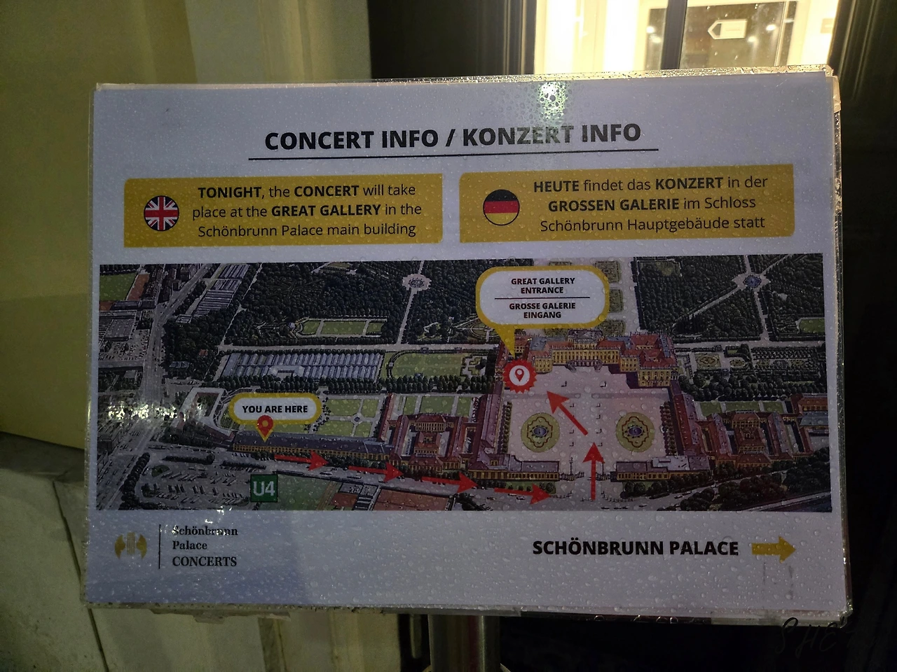 하지만 가끔은 다른 장소에서 하는데, 이날도 그런 날이었다. 이날은 쉔부른 궁전 메인 건물의 메인 홀인 '그레이트 갤러리'에서 공연을 했다. 그러나 예매한 티켓 정보에는 매표소가 여전히 오랑주리로 표기되어 있기에, 일단은 오랑주리로 가서 티켓을 찾아야 하는 것으로 이해하고 갔다. 그레이트 갤러리면 숙소에서 트램 한 번으로 갈 수 있지만, 오랑주리는 메인 궁전 건물에서 조금 떨어져 있어서 지하철을 갈아타야 했다.