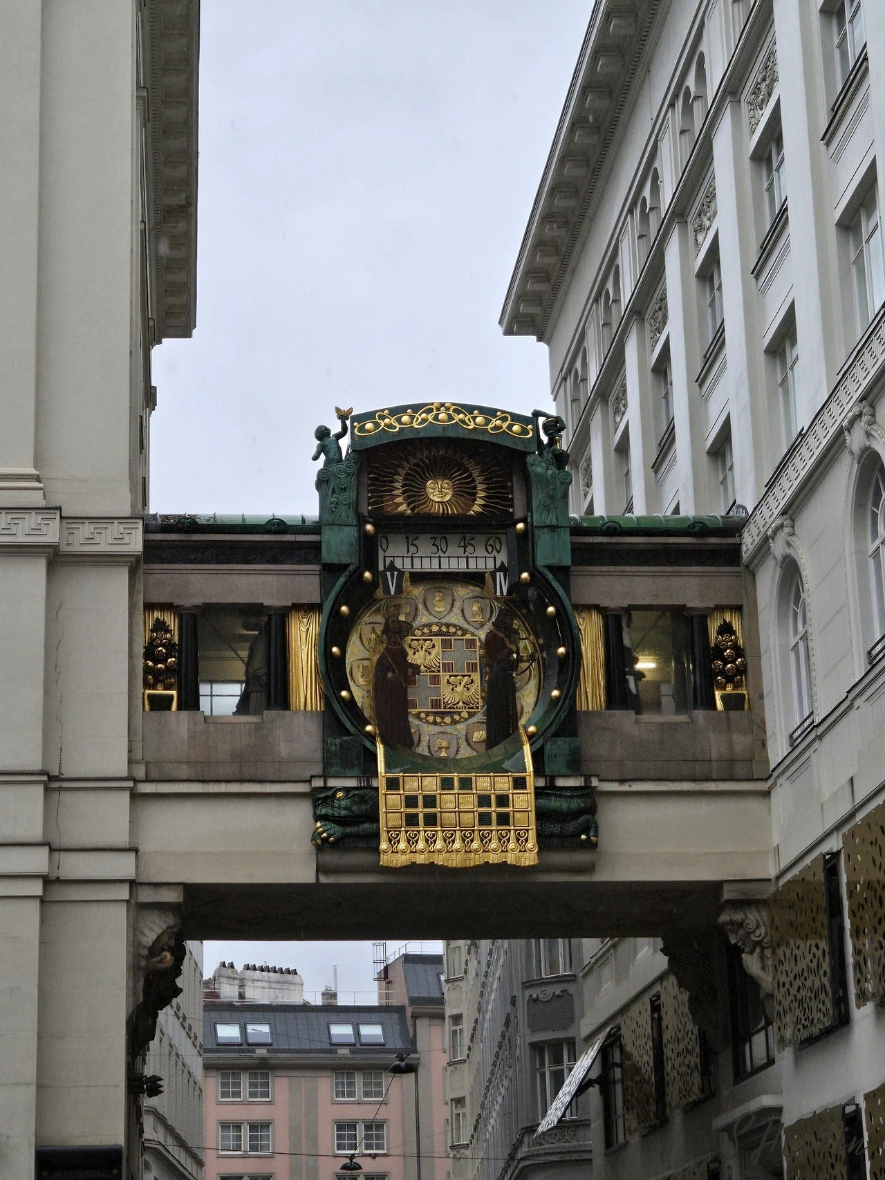 인형시계는 성슈테판대성당에서 골목 하나만 지나면 있었지만, 밖에 서서 봐야 한다는 것이 이날의 관광객들에게는 치명적인 단점이었다. 정각마다 새로운 인형이 나온다는데, 5시 정각이 되었지만 별다른 변화가 없어 보였다. 누군가의 후기에 따르면 10분씩 늦기도 한다고 하기에 어쩔 수 없이 빗속에서 기다려보았다. 우리 외에도 몇몇 관광객들이 우리와 같은 곳을 바라보며 기다렸다. 하지만 인형시계는 변화가 없었다. 마치 오스트리아를 떠나지 않는 폭풍 보리스처럼.
