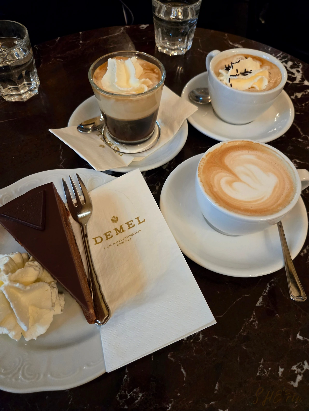 오스트리아 전통 팬케익 디저트인 카이저슈마렌 (Kaiserschmarrn)과 커스터드 안에 잼이 들어간 듀카텐부흐텐 (Dukatenbuchteln), 그리고 초콜릿 케이크인 자허 토르테 (Sachertorte)를 하나씩 주문했고, '비엔나커피'도 종류별로 주문했다. 사실 '비엔나커피'는 곧 아인슈페너인 줄 알았는데, 막상 알아보니 비엔나식 커피는 생각 외로 종류가 다양했다.